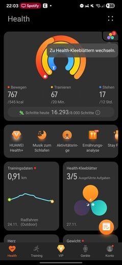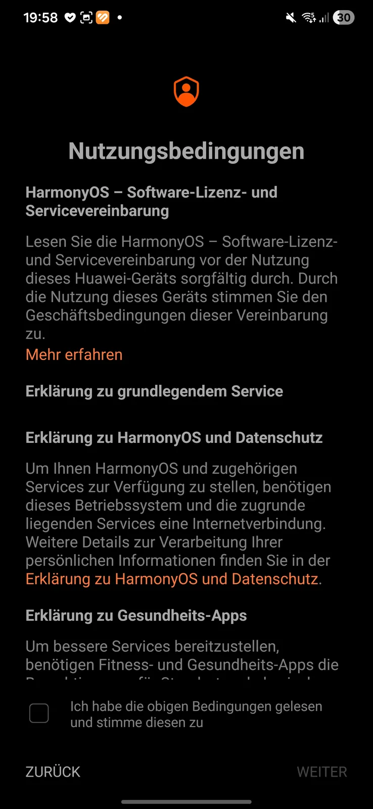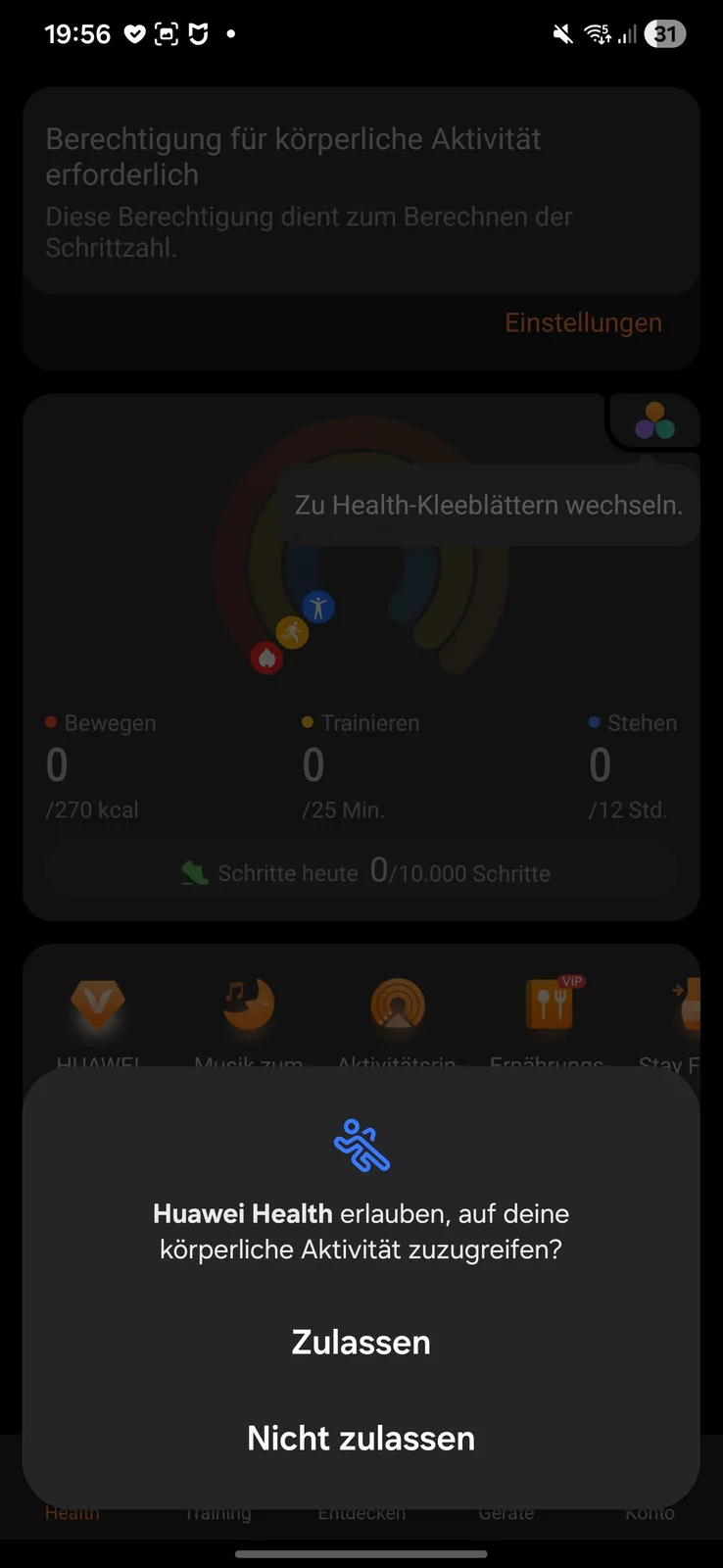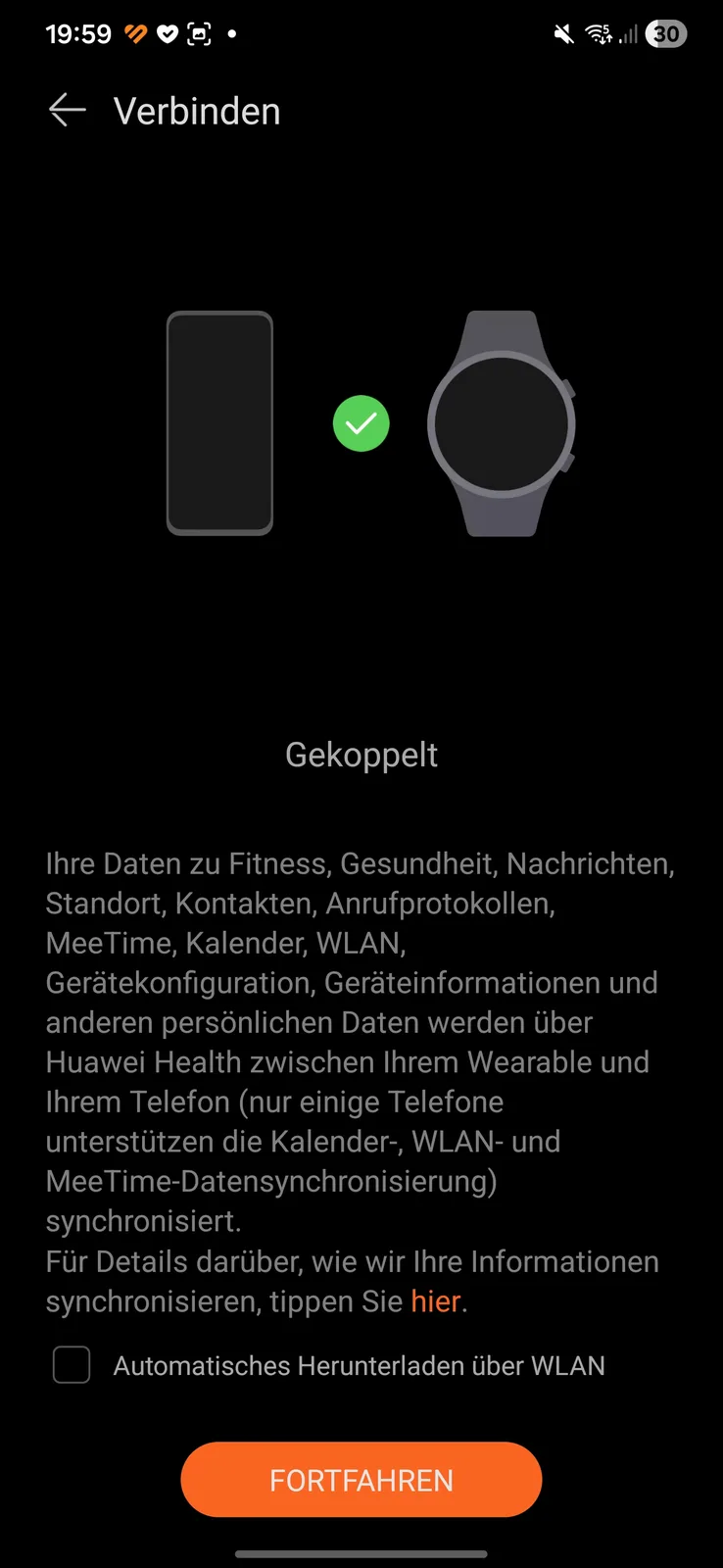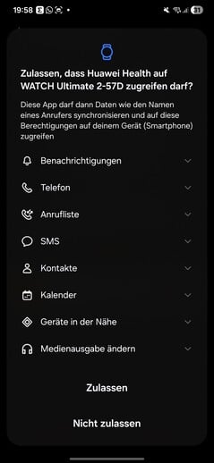 在测试中,智能手表立即被检测到并顺利配对。设置过程中必须授予若干权限。还需要一个华为 ID。过程结束后,手表上会启动一个教程。有一点很突出:智能手表上打开的每个应用程序都需要单独的数据处理许可。