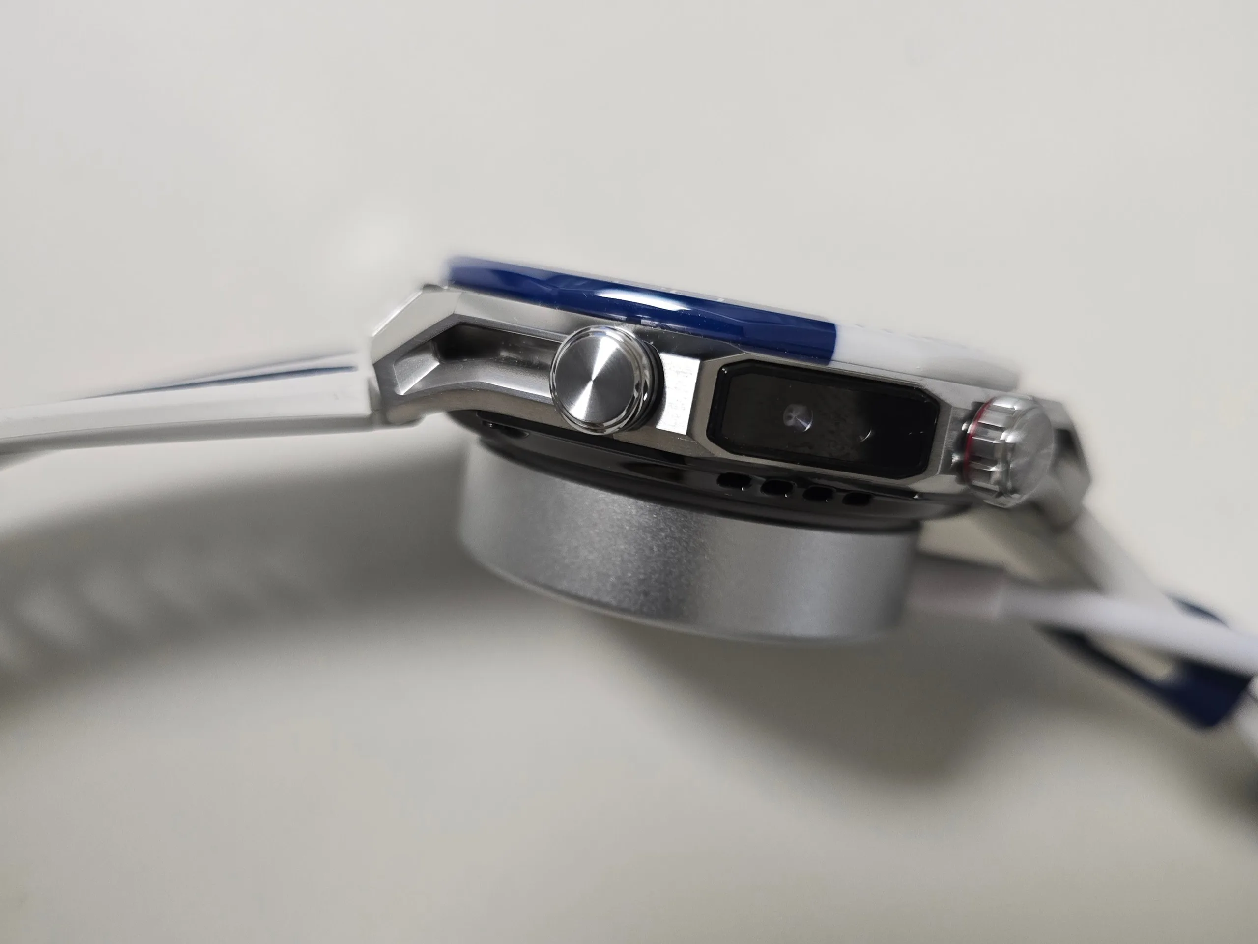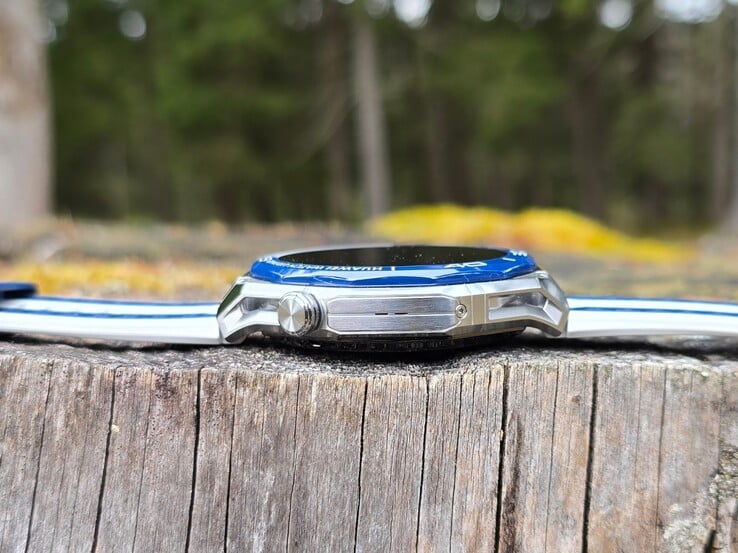 右侧有一个可旋转和按压的表冠、一个按钮、一个扬声器和华为的 X-Tap 传感器。左侧是另一个按钮和深度传感器。22 毫米的表带无需工具即可更换。