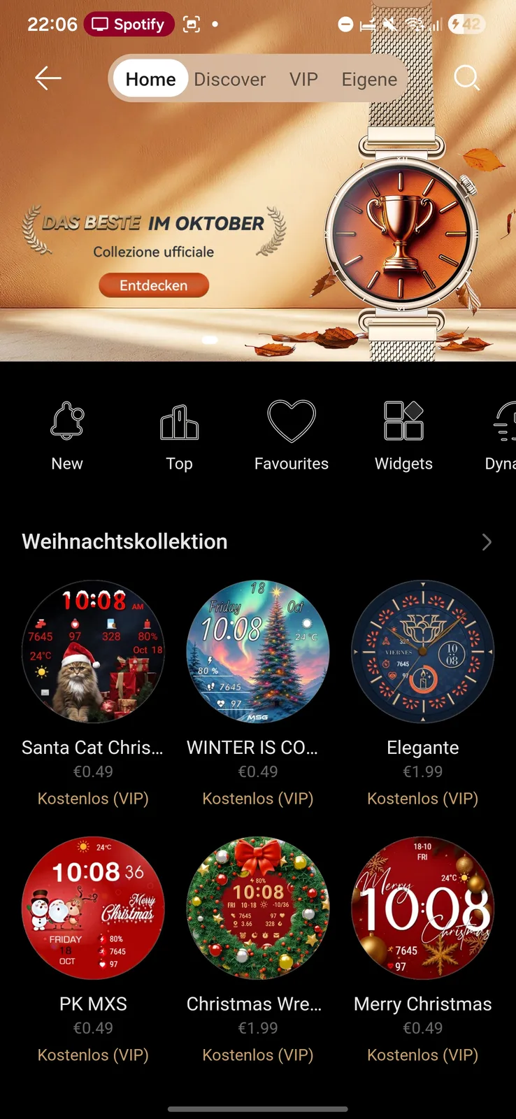 已完成的训练显示在 "训练 "下。VIP 可以解锁进入付费的 Plus 层级。设备 "选项卡包含设置、AppGallery、音乐管理和大量可选表盘。