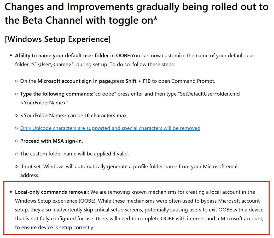 在以前的版本中,该公司阻止了流行的 OOBEbypassnro 命令,该命令允许用户跳过部分初始设置过程。这最终允许了离线账户的创建。现在,微软又加倍坚持了自己的立场。