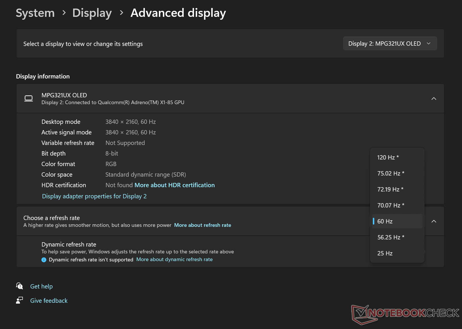 请注意,我们使用微星的 mpg 321urx qd-oled显示器进行了测试,该显示器配备 DisplayPort 1.4a 端口,在基于 AMD、英特尔和Apple M 的设备上以 4K 和 120 Hz 或更高的频率输出没有任何问题。归根结底,骁龙 X 系列显示器的外接显示器支持似乎暂时没有达到宣传的效果。遗憾的是,这究竟是设计原因还是 Adreno 驱动程序故障所致,还有待观察。