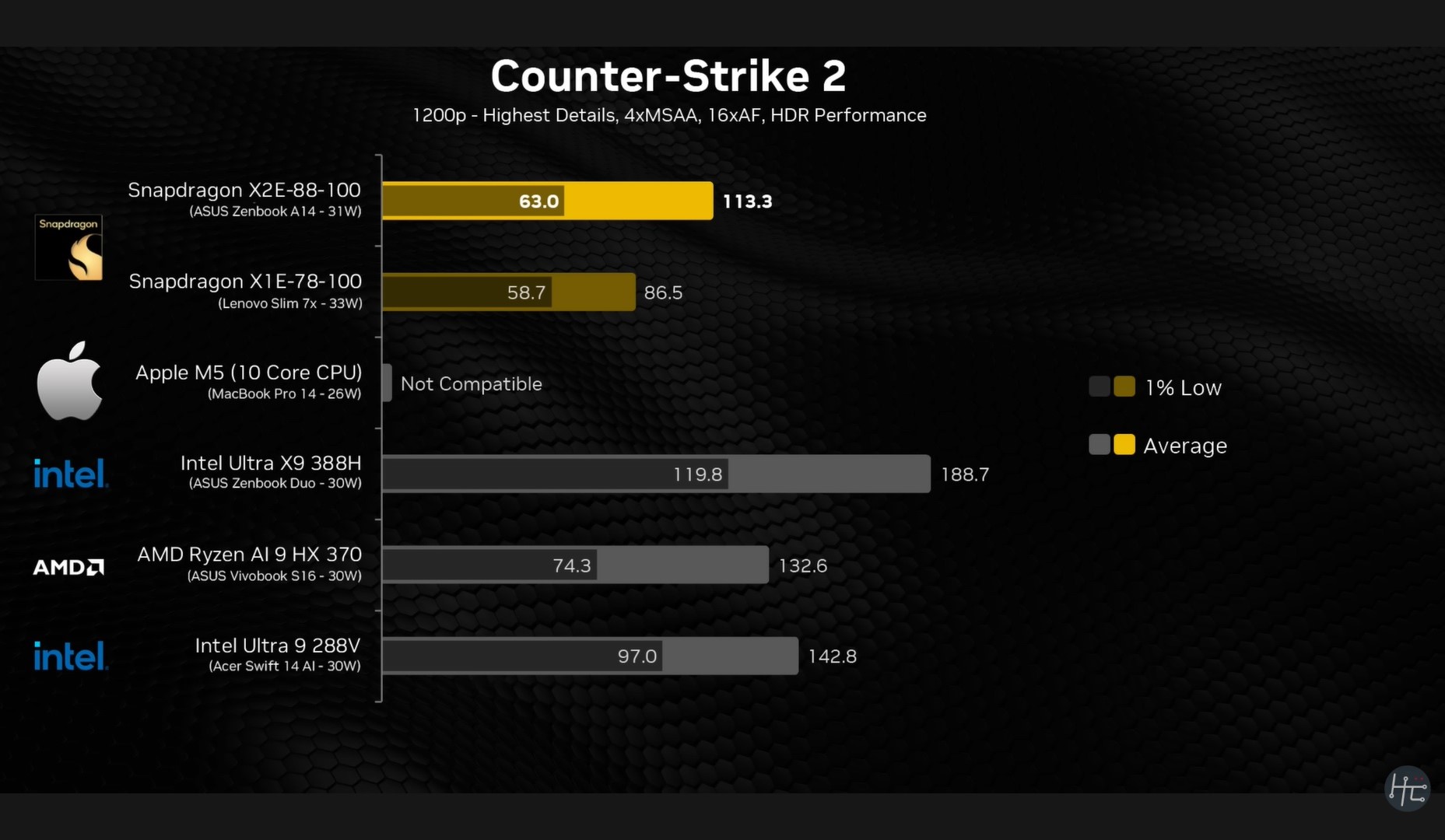 我们在《反恐精英 2》中观察到了相同的模式,骁龙 X2 Elite 的平均帧数超过了 113 FPS,但 1%的最低帧数保持在 63 FPS。与 Core Ultra X9 388H 的平均 188.7 FPS 和 1% 低值 119.8 FPS 相比,问题就很明显了。