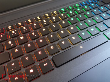在这款笔记本电脑上,你可以选择机械键盘(如我们的测试机型)或 "静音薄膜键盘"。这两种键盘都带有 RGB 背光,但只有机械键盘才有独立的 RGB 灯光按键。静音薄膜键盘只有单区 RGB 灯光。