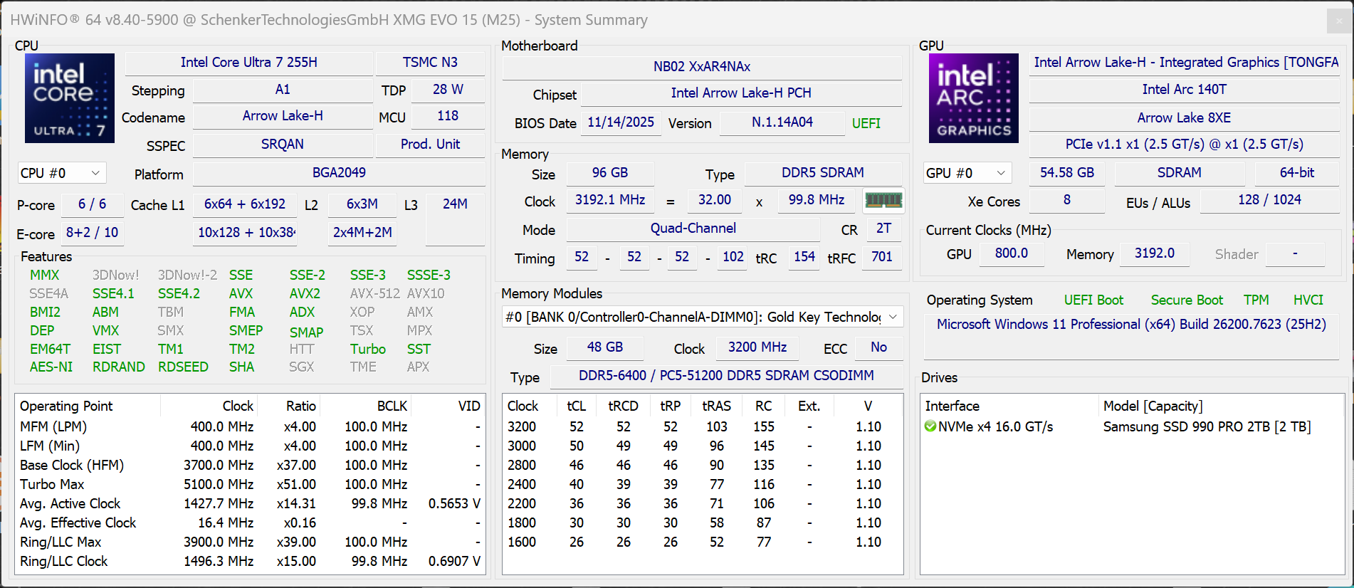 | Schenker XMG Evo 15 (M25) Intel Core Ultra 7 255H ⎘ Intel Arc Graphics 140T ⎘ 32 GB Memory, 2048 GB SSD | 1.8 kg | 22 mm | 15.30" 2560x1600 197 PPI IPS | ||