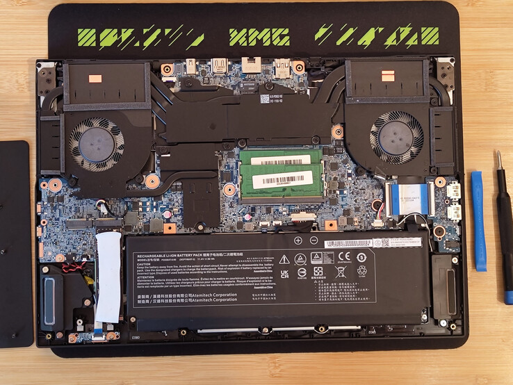 整整15颗螺丝固定了底盖。拧开这些螺丝后,借助于一个塑料开启工具,可以很容易地从前面撬开盖子。在它的下面,你会发现可更换的内存和一个免费的M.2插槽,用于额外的SSD。笔记本电脑中还包括适当的热垫,以及一张带有驱动程序的光盘,一个具有相同内容的U盘,一个大鼠标垫和一个开瓶器。