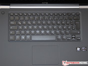 Our sample XPS 15 uses a fairly compact chiclet keyboard without a dedicated numeric keypad. The notebook uses the American English keyboard layout and reminded us of the XPS 13. The 15 x 15 mm (0.59 x 0.59 inch) keys have a slightly concave surface and the smooth plastic surface has a nice grip. A three-way adjustable backlight (maximum, medium, and off) automatically activates when one types, allowing a user to write in the dark. This further enhances the already-elegant overall impression of the keyboard.