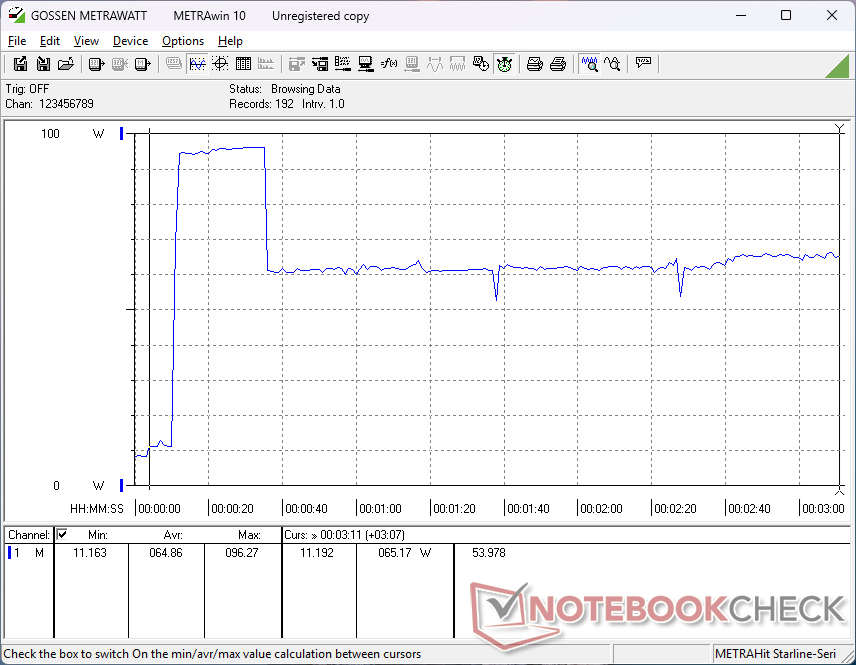 在运行 Prime95 压力测试时,CPU 会提升至 2.9 GHz、69 W 和 100 C,几秒钟后又降至 2.2 GHz、40 W 和 78 C,这表明 Turbo Boost 的持续性有限。这种节流与上面的 CineBench R15 xT 循环结果和下面的功耗行为相辅相成。