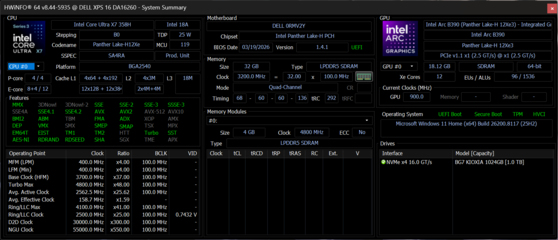 | Dell XPS 16 Core Ultra 5 325 Intel Core Ultra 5 325 ⎘ Intel Graphics 4 Xe3 Panther Lake iGPU ⎘ 16 GB Memory, 512 GB SSD | List Price: 1600 USD | 1.7 kg | 15.4 mm | 16.00" 1920x1200 142 PPI IPS | |