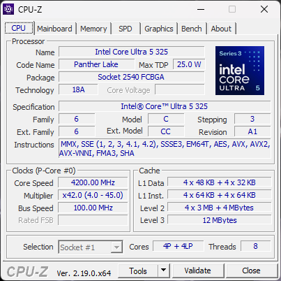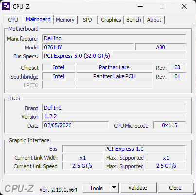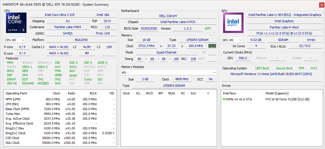 | Dell XPS 16 Core Ultra 5 325 Intel Core Ultra 5 325 ⎘ Intel Graphics 4 Xe3 Panther Lake iGPU ⎘ 16 GB Memory, 512 GB SSD | List Price: 1600 USD | 1.7 kg | 15.4 mm | 16.00" 1920x1200 142 PPI IPS | |