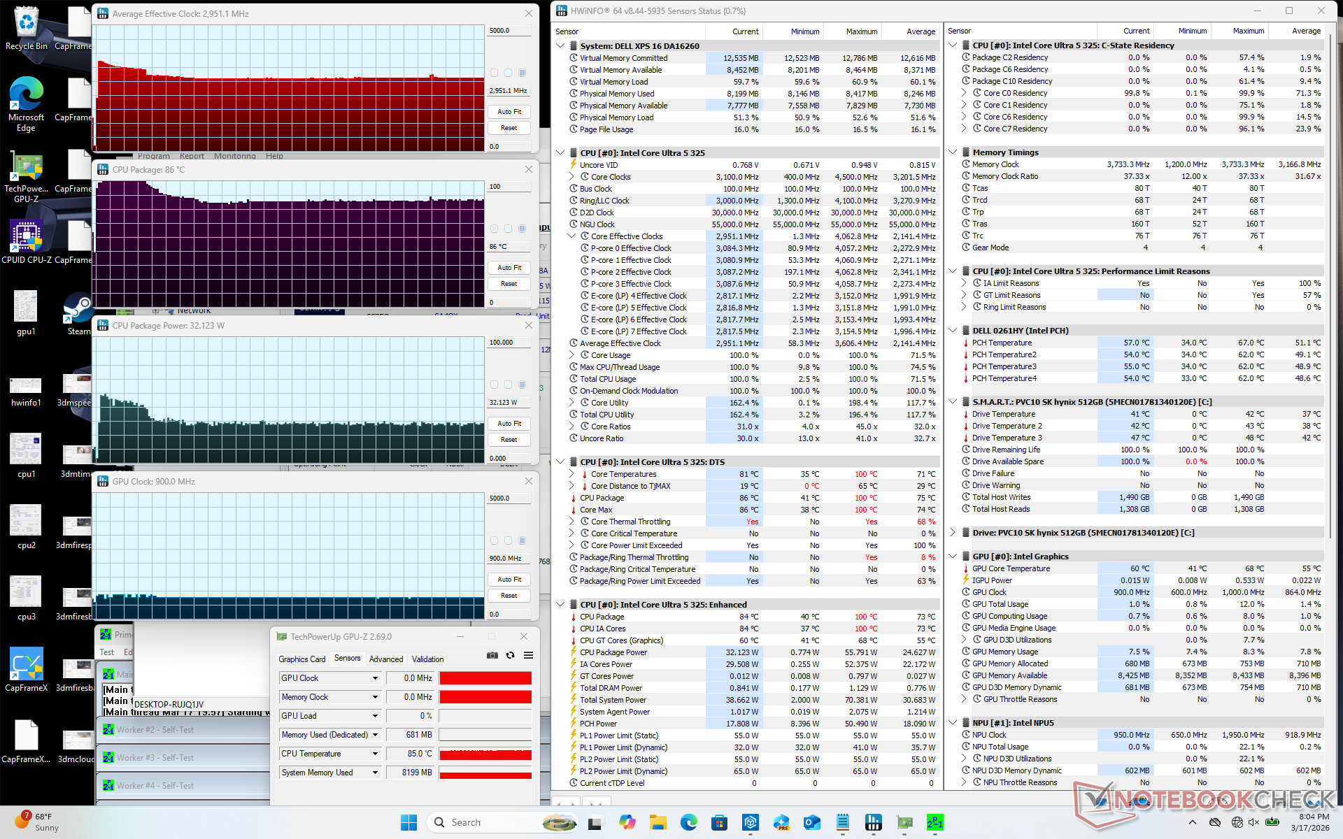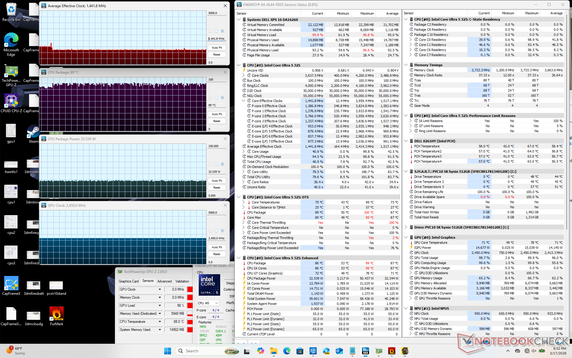 在运行《赛博朋克 2077》时,CPU-GPU 负载更加平衡,核心温度稳定在 89 摄氏度,而配备速度更快的GeForce RTX 显卡的 2025 XPS 16 核心温度仅为 75 摄氏度。核心温度普遍较高可能是上述表面温度较高的原因。