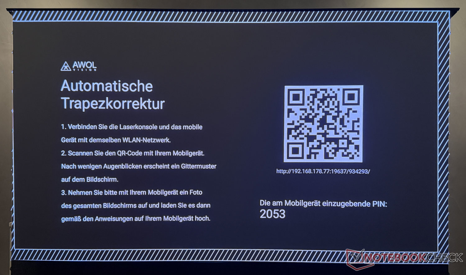 AWOL Vision 宣称可以自动校正梯形。正如我们从现代投影仪(如 星云 X1 Pro或 Valerion VisionMaster Max等现代投影机的经验来看,自动解决方案在实践中作用不大。如果在设置中激活该选项,图像不会自动对齐。相反,屏幕上会显示一个包含数字代码的 QR 码,必须使用智能手机摄像头进行扫描。