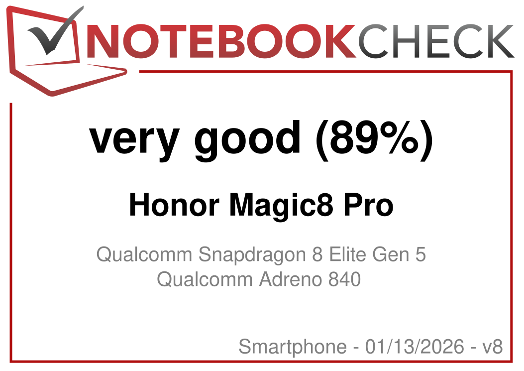 在我们的测试中,Honor Magic8 Pro 证明了自己是一款几乎完整的旗舰设备,其优质的制造质量、IP69K 认证以及亮度超过 6,000 cd/m² 的鲜艳 LTPO OLED 显示屏给我们留下了深刻印象。Snapdragon 8 Elite Gen 5 性能卓越,但在持续负载情况下会出现明显的跳动。其他亮点包括七年更新保证、多功能 AI 功能(包括 AI 按钮)以及包括超声波指纹传感器和 3D 面部识别在内的全面安全选项。