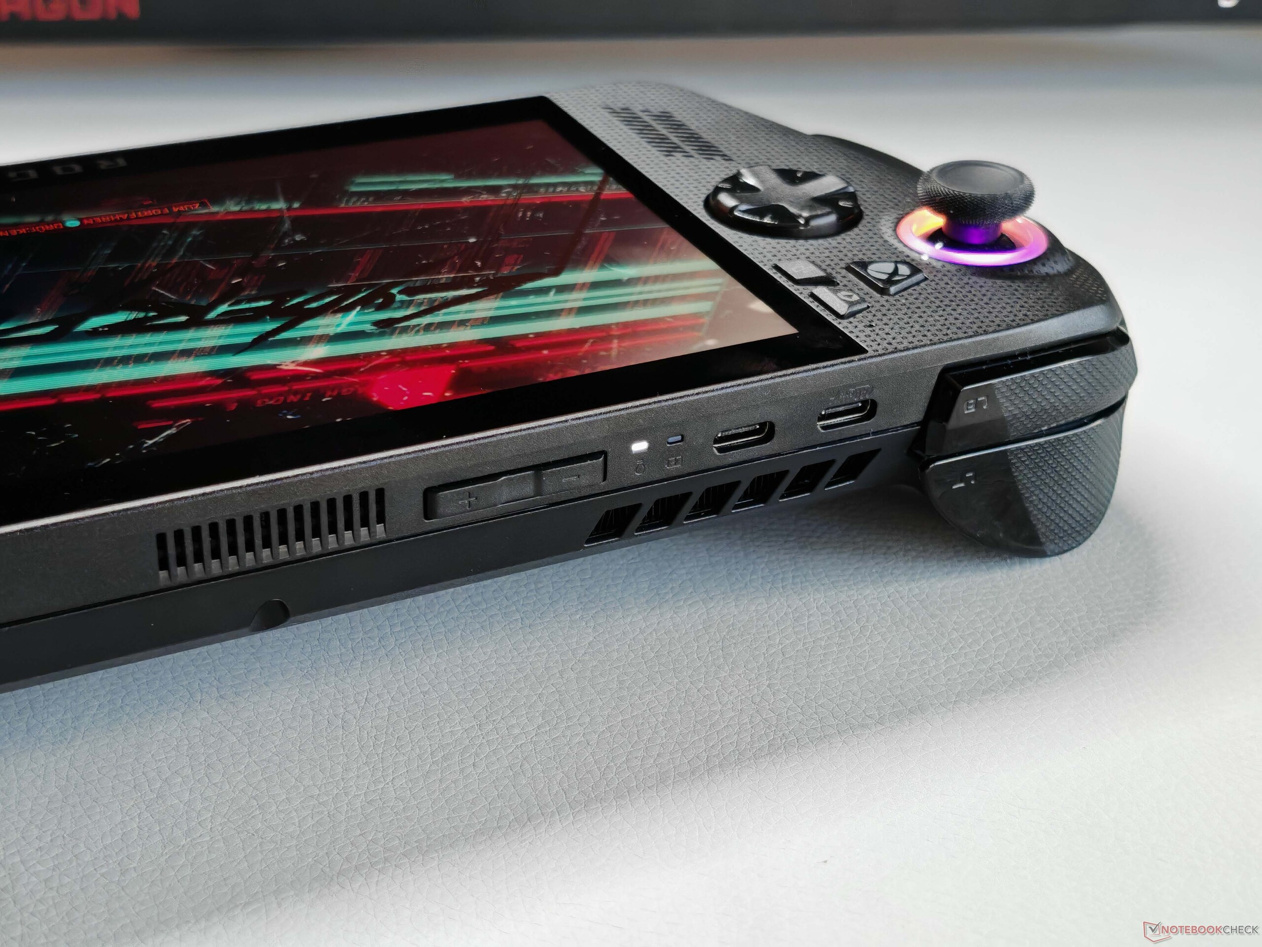 显示屏没有变化,华硕再次使用了熟悉的 7 英寸 IPS 屏幕,分辨率为 1080p,120 Hz 和 VRR。屏幕边框仍然很宽,如果能增加一块更大的面板就更好了。整体画质不错,但没有 OLED 面板那么亮丽。不过,也没有出现 PWM 闪烁的问题,IPS 屏幕仍然是游戏中非常不错的选择。