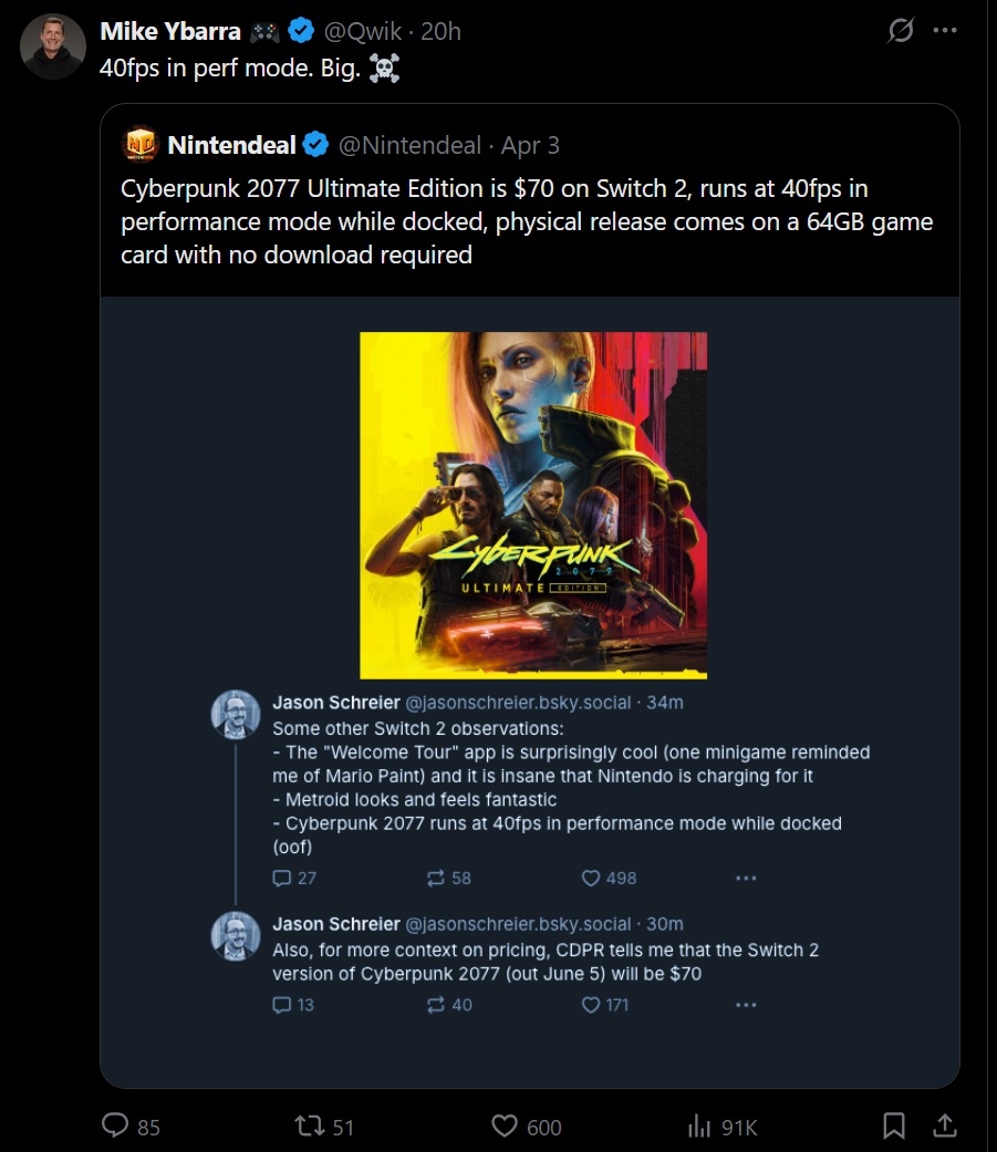 一些读者惊讶地发现Ybarra 在 X的第一反应是:"Switch 2 对我来说是硬通货"。伊巴拉解释说,他对发布会上展示的任何 Switch 2 游戏都不感兴趣。他还对任天堂新主机所承诺的增强性能表示反对。在回应《塞尔达传说:王国之泪》将在系统上以 4K 60fps 运行的消息时,Ybarra 说:"这看起来像是 2000 年的游戏。"
