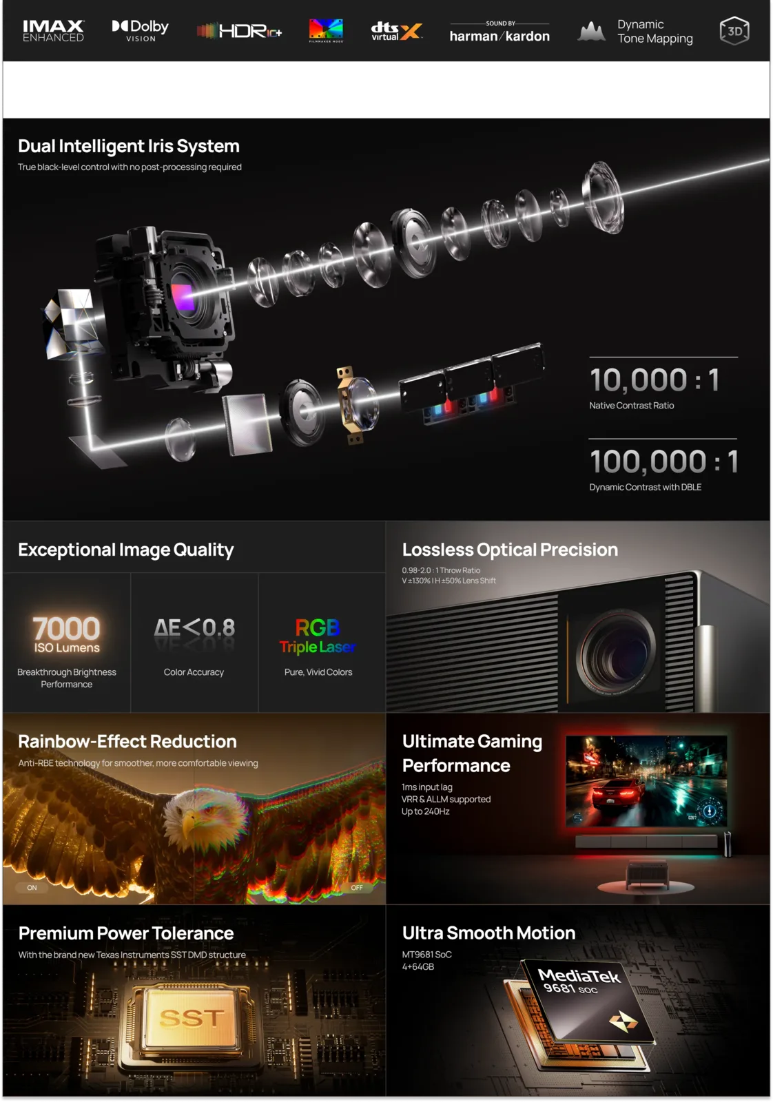 旗舰产品 Titan Noir Max 配备了 RGB 三激光技术和双光圈系统。据悉,该投影机专为专用家庭影院和高端生活空间打造。此外,凭借 7000 ISO 流明的输出,该投影机的画面对比度可达 100000:1。