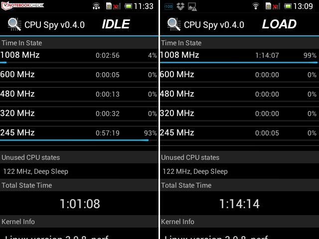 首先,我们检查了工具CPU间谍行为的SoC。在空闲模式下的Snapdragon S1的工作的时间超过90%,只有245 MHz,因此消耗的能量很少。在负载下被激活为1008 MHz的最高的性能,没有任何问题。