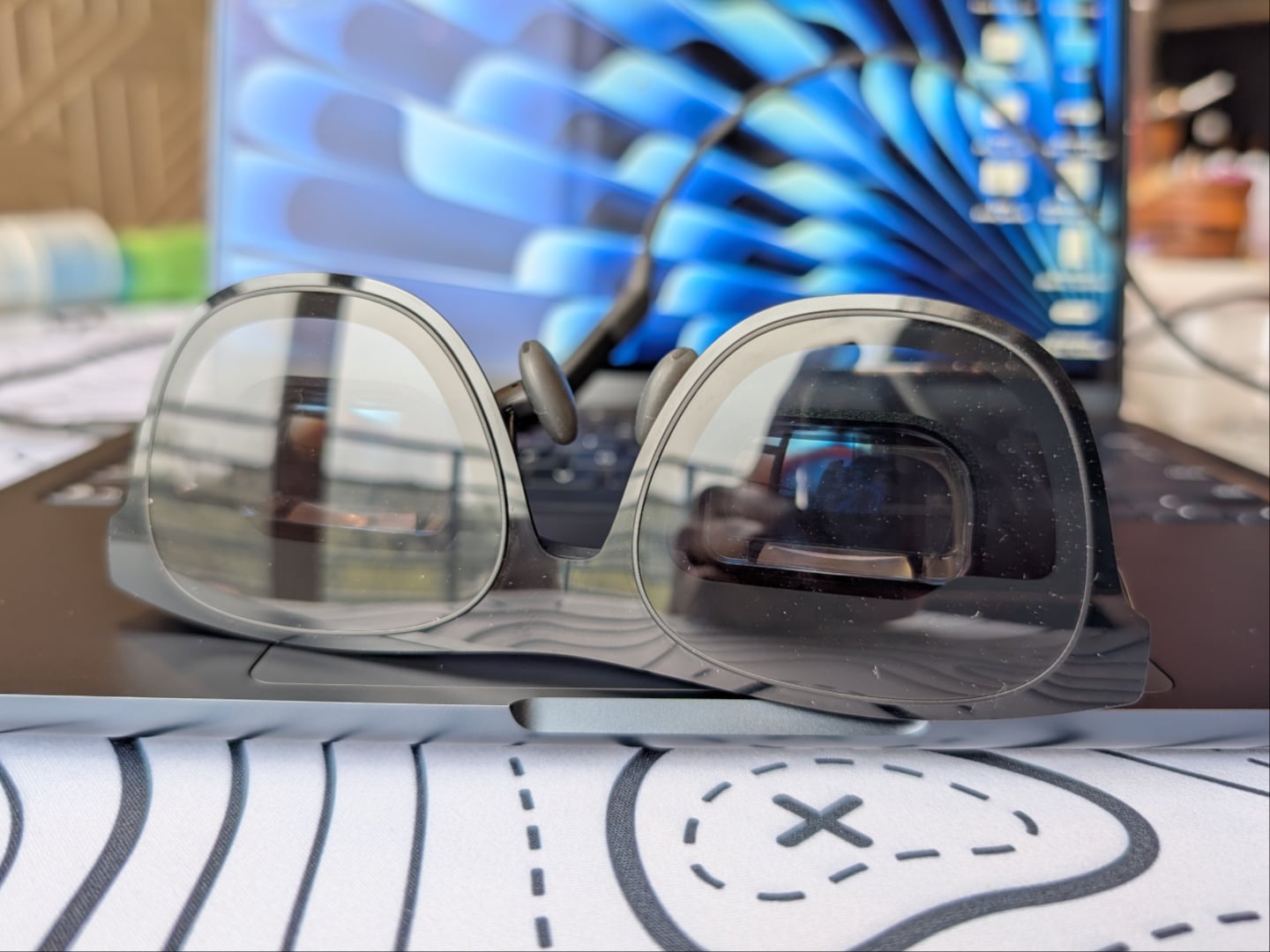USB 线缆来自耳后,足够长,可以连接面前桌上的笔记本电脑或放在口袋里的手机。它既不会增加眼镜的重量,也不会碍事,所以这是个优点。