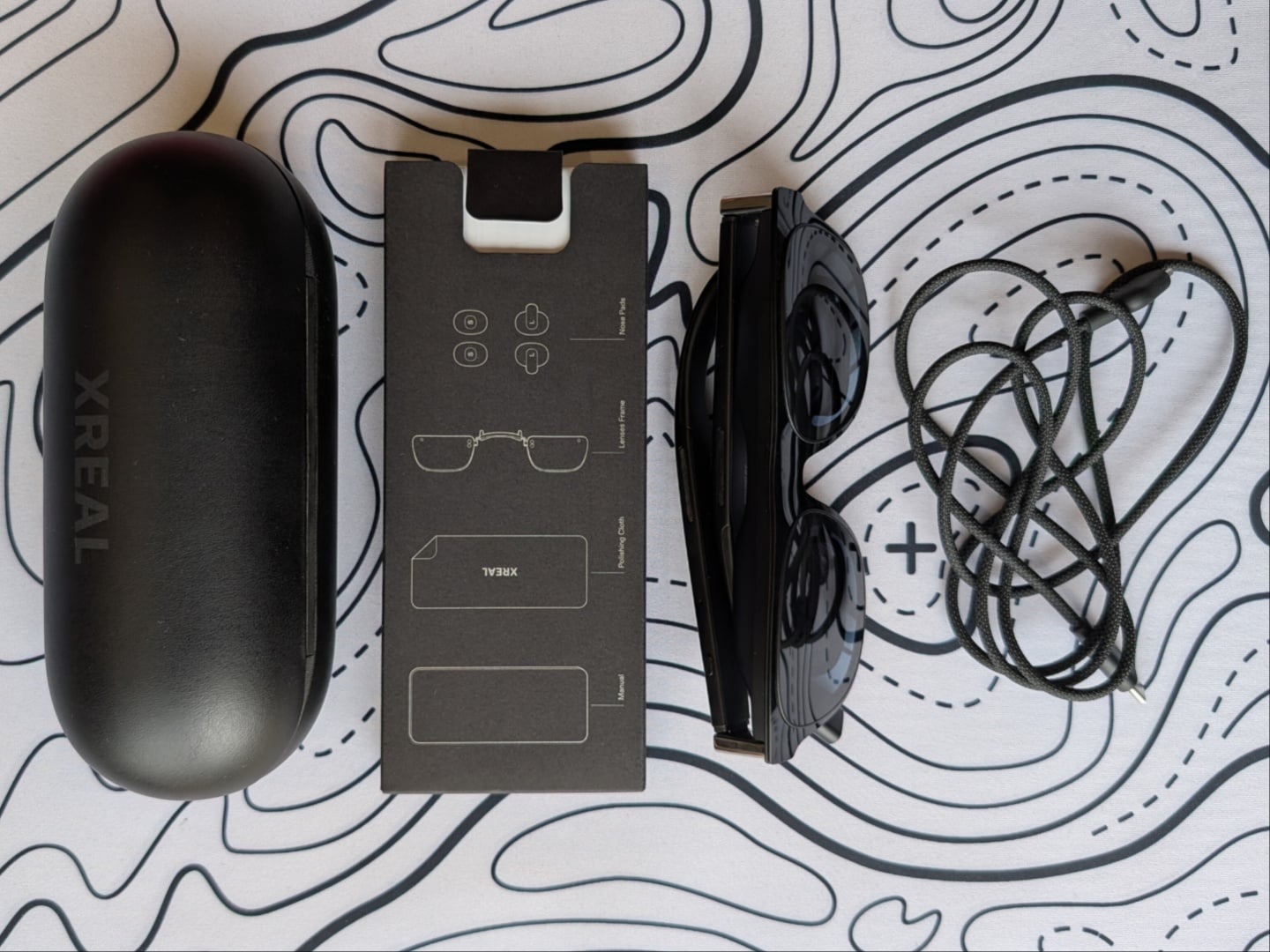 Xreal One Pro 眼镜整齐地包装在一个黑色的盒子里,金色的点缀给人一种高档的感觉。眼镜被放置在一个相对较大的盒子里,盒子里有足够的空间放置USB Type-C数据线和眼镜。Xreal 还提供了一块超细纤维布、一个镜框和不同尺寸的鼻垫,以提供理想的观看体验。需要处方镜片的用户(像我一样)可以从 HonsVR 单独购买一套。