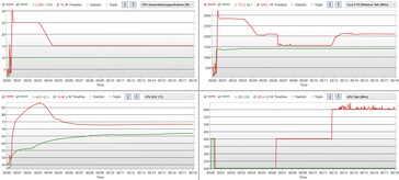 在 "节省电池 "模式下的行为对比很有趣:温度曲线仍然远离临界值。同时,系统最终被下调到几乎与最大性能时的时钟速率相同,因此,至少从长远来看,各自的处理性能值接近。