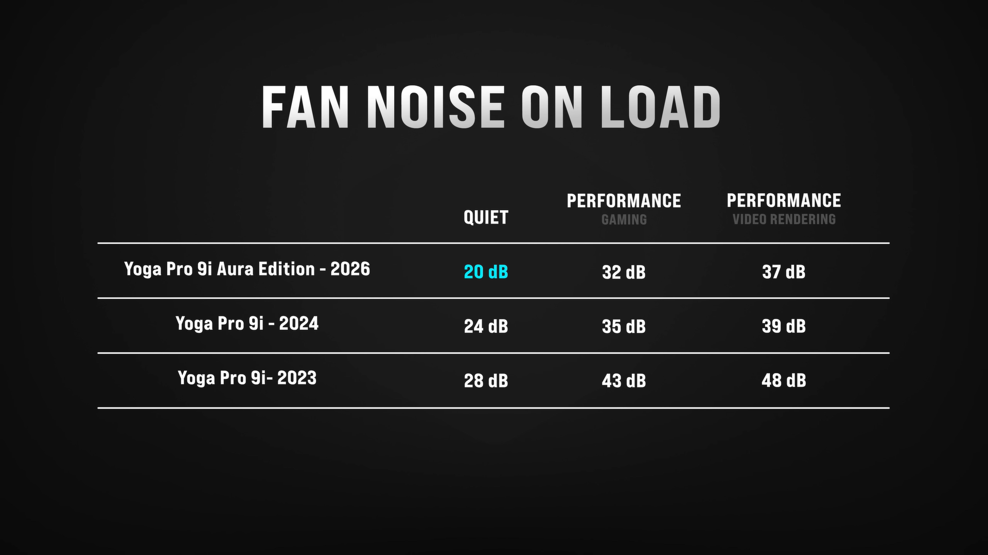 换句话说,联想的新散热解决方案与英特尔 Panther Lake 芯片相结合,在控制噪音方面似乎做得非常出色。这也预示着 Yoga Pro 9i Aura Edition(2026)的散热性能良好,因为如果笔记本电脑产生大量热量,风扇噪音就会更大。