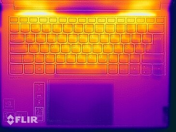 Yoga Slim 7 Pro 14基本上是一个非常安静的伴侣,大多数时候,你根本听不到笔记本电脑的声音,或者只听到偶尔的安静呼啸声。另一方面,在负荷较重的情况下,例如在游戏过程中,两个风扇会很快达到43.5 dB(A),这时就会明显感觉到噪音。在可选的最高性能模式下,它达到了略高于47分贝(A),尽管性能几乎没有变化。在省电模式下,这个紧凑的设备非常安静,最大为31.4 dB(A),即使在负载下也是如此。我们没有注意到任何其他恼人的噪音,如线圈啸叫。该 瑜伽14不含dGPU在负载情况下仍然明显更安静。