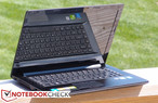 不过,在其他方面它也难免的有不少缺点。首先也是最重要的,它的做工质量和材料质量明显被放在了最次要的位置,除去掌托附近的拉丝金属表面,它的塑料材质给人以非常廉价的感觉。机身的稳定性不算差,不过塑料的屏幕上盖的抗压能力很差,且很容易在实际使用中留下划痕。同时,它的屏幕非常让人失望,低亮度、低对比度、很差的色彩还原能力、狭窄的可视角度范围,和最烦人的一项:镜面。机身的扬声器效果也不好,它只能提供可以接受的中频段音效,而明显缺少低音和高频的响应。最后,在输入设备方面,它的键盘属于AccuType键盘的低端版本,无法与Edge E431或更高端的联想笔记本的键盘相比(不过它的触控板质量相当高)。