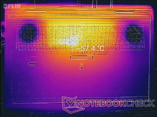 (-) The maximum temperature on the upper side is 45.6 °C / 114 F, compared to the average of 38.2 °C / 101 F, ranging from 22.2 to 69.8 °C for the class Workstation.