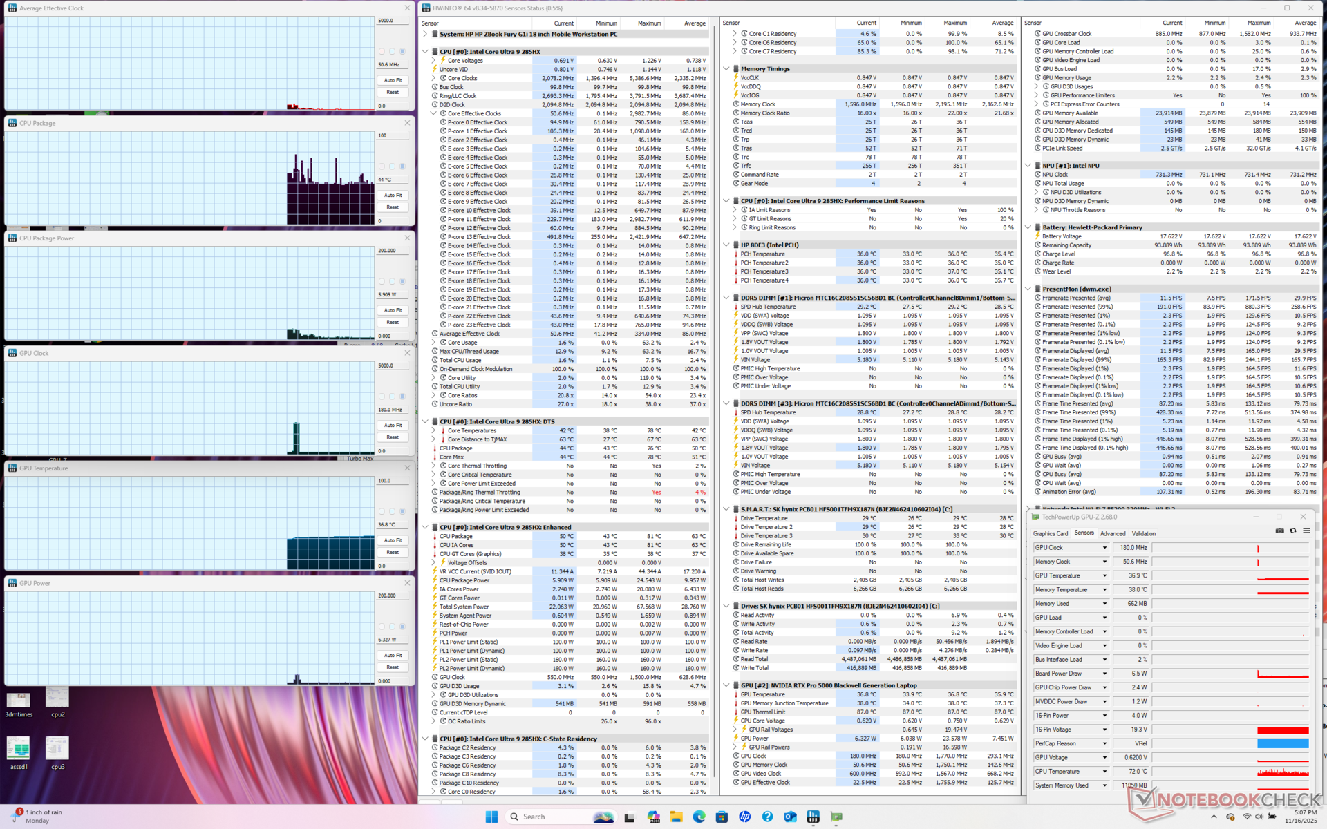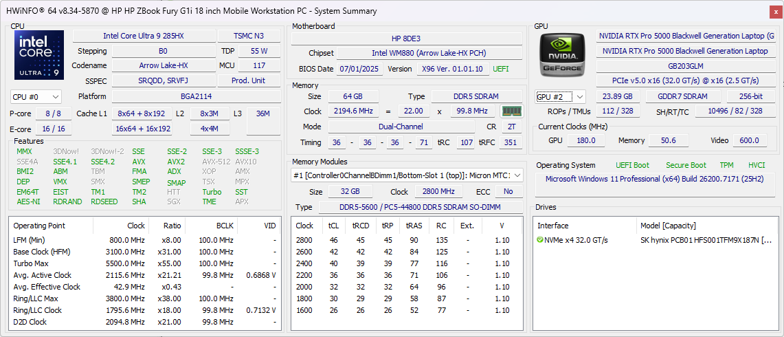 | HP ZBook Fury G1i 18 Ultra 9 285HX, RTX PRO 5000 Blackwell Generation Laptop, , IPS, 2560x1600, 18" | Dell Pro Max 18 Plus MB18250 Ultra 9 285HX, RTX PRO 5000 Blackwell Generation Laptop, , IPS, 2560x1600, 18" | Schenker Key 18 Pro M25 RTX 5090 Ultra 9 275HX, GeForce RTX 5090 Laptop, Samsung 9100 Pro 4 TB, IPS, 3840x2400, 18" | Lenovo ThinkPad P16 Gen 2 i7-14700HX, RTX 4000 Ada Generation Laptop, SK hynix PC801 HFS001TEJ9X162N, IPS, 2560x1600, 16" | HP ZBook X G1i 16 Ultra 7 265H, RTX PRO 2000 Blackwell Generation Laptop, Samsung PM9A1 MZVL22T0HBLB, IPS, 2560x1600, 16" | HP ZBook Studio 16 G11 Ultra 9 185H, RTX 3000 Ada Generation Laptop, Kioxia XG8 KXG80ZNV1T02, IPS, 3840x2400, 16" | |