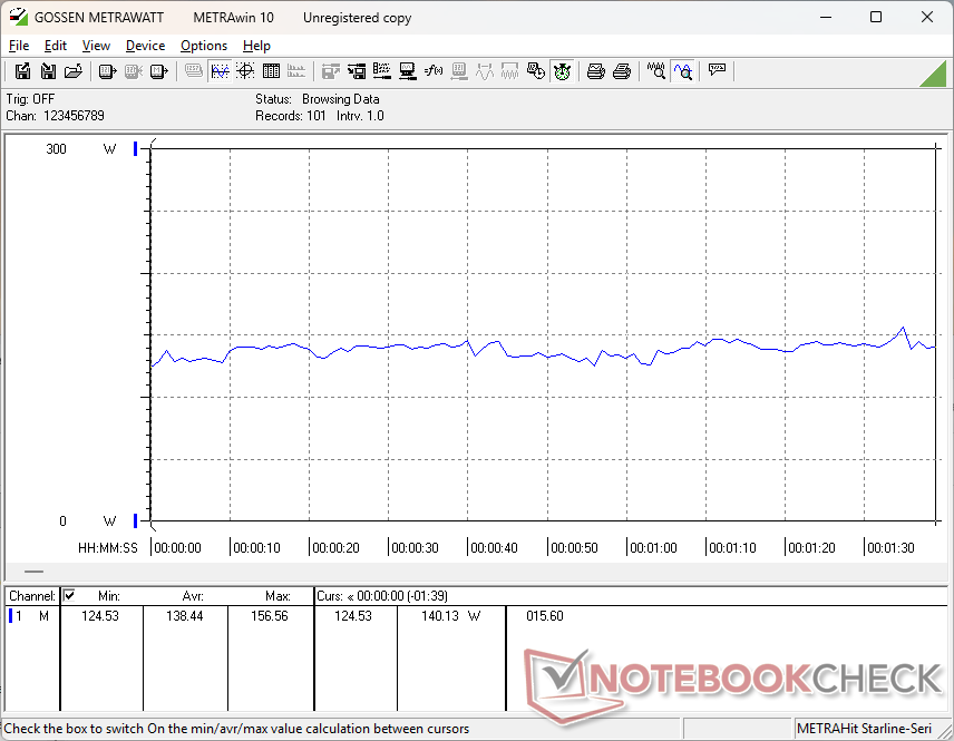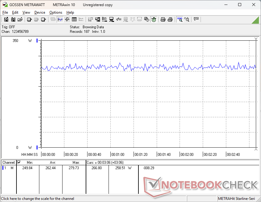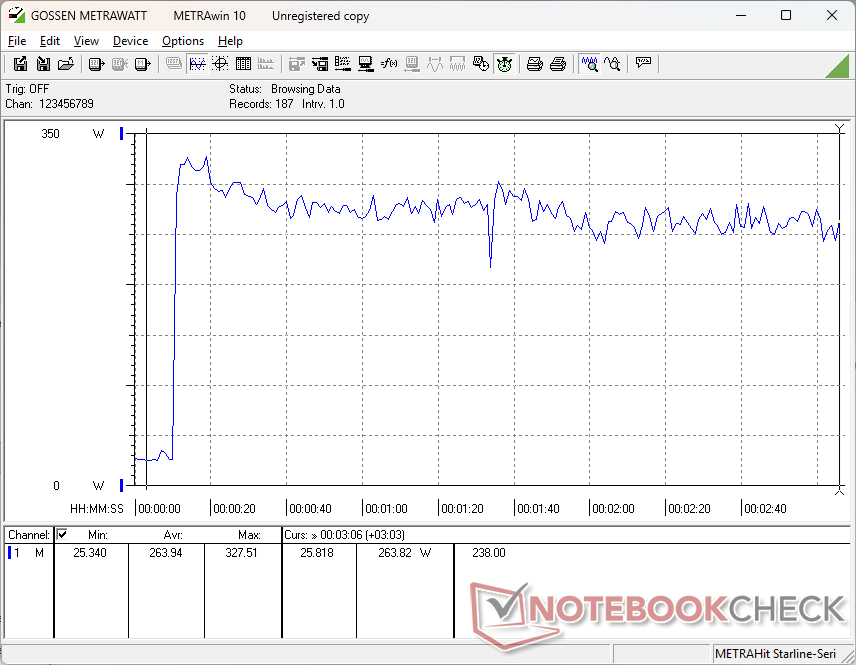 惠普配备的是 330 瓦 AC 适配器,而戴尔配备的是 280 瓦 USB-C AC 适配器。因此,惠普的最大功耗更高,在我们的测试中可达 328 W,而戴尔则为 281 W,但由于热限制或强加的上限,这种高功耗是短暂的。例如,同时运行 Prime95 和 FurMark 时,功耗会达到 328 W 的峰值,然后迅速稳定在 265 W 左右,这与我们在戴尔上观察到的情况类似。因此,就性能而言,较大的 330 瓦交流适配器并不重要。