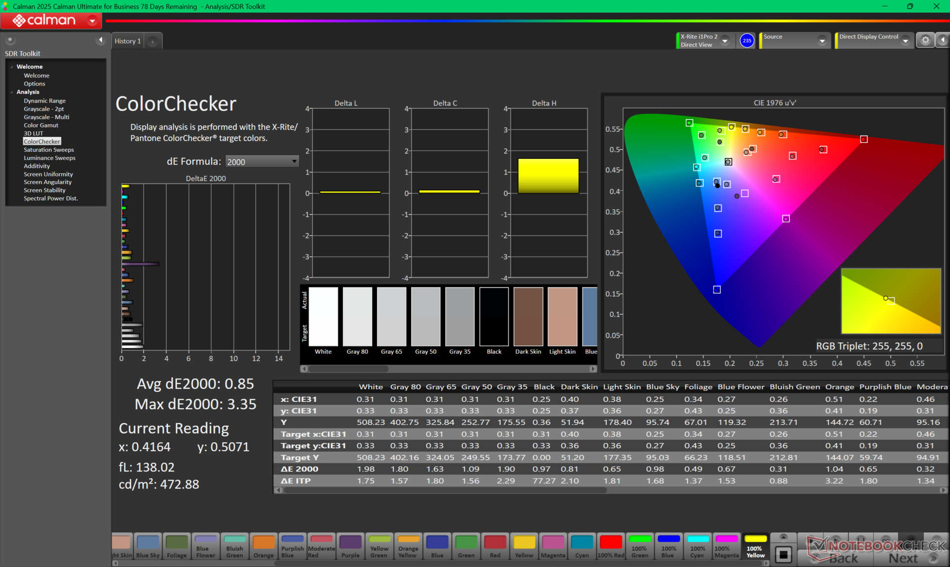 | Colorchecker dE 2000 calibrated * | 0.85 | 0.47 45% | 0.8 6% | 0.63 26% | 0.75 12% | 1.46 -72% |