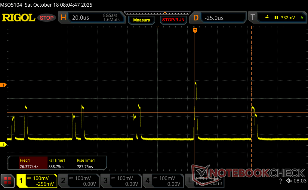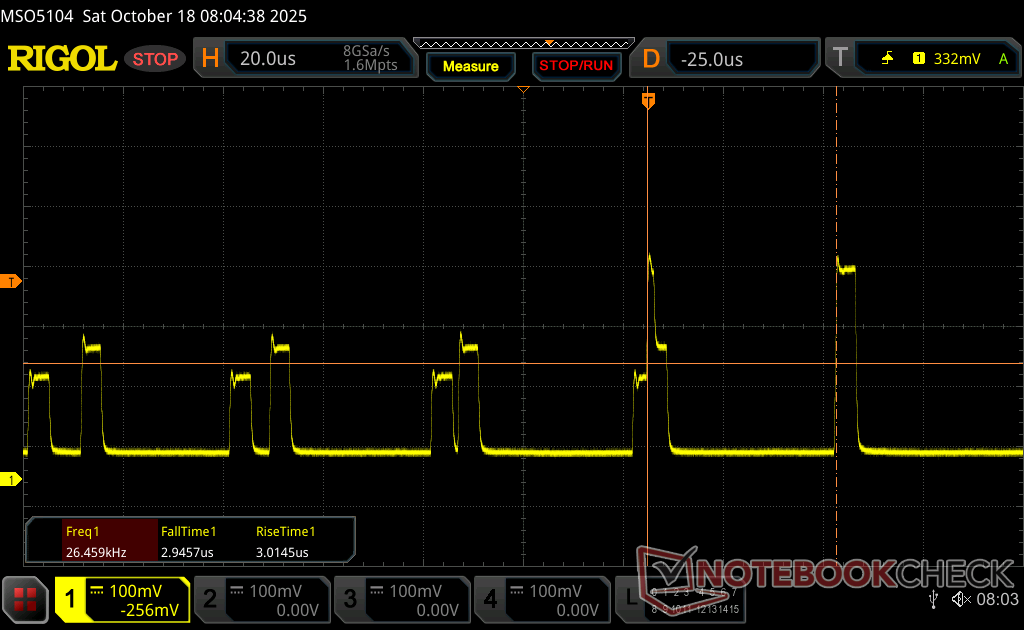 | Screen flickering / PWM detected | 26536 Hz Amplitude: 47 % | ≤ 74 % brightness setting | |