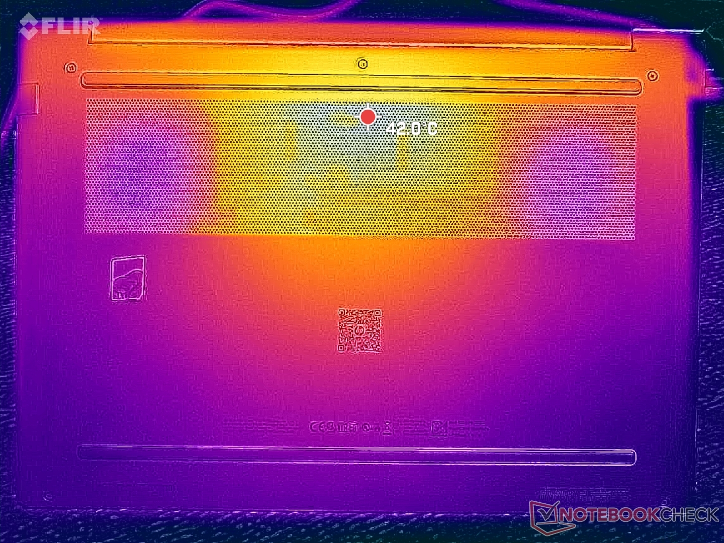 表面温度向中心发展的温度最高,在运行苛刻负载时可达到 36 摄氏度以上,明显低于我们在 ThinkPad P16 Gen 2 上记录的温度。 ThinkPad P16 Gen 2或 戴尔Precision 5690.