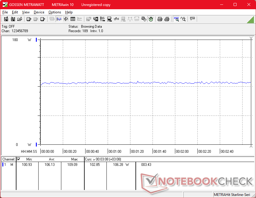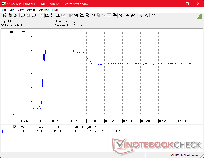 当 CPU 和 GPU 处于满负荷工作状态时,我们可以测量到小巧(约 13.8 x 6.5 x 2.2 厘米)的 150 瓦交流适配器的临时最大功耗为 153 瓦。