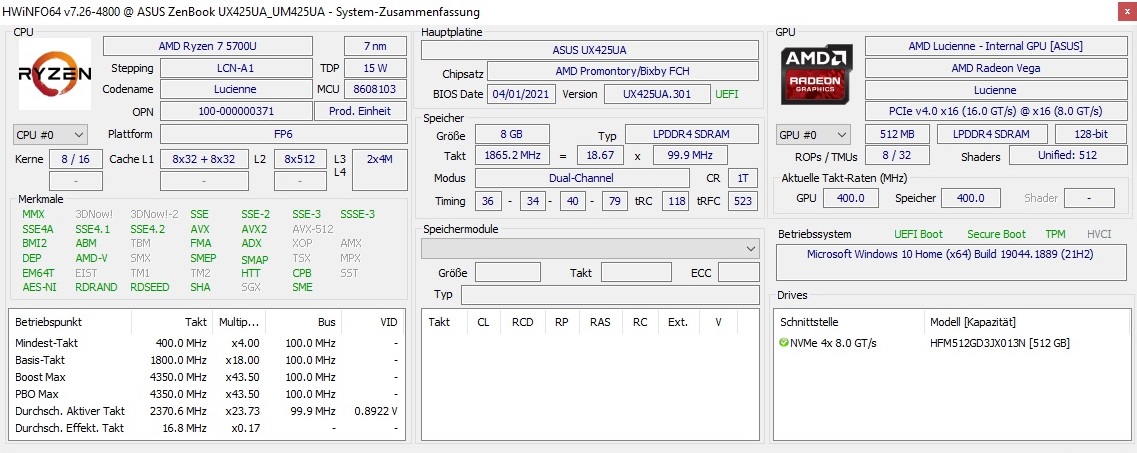 在评测了搭载酷睿i7-1165G7的ZenBook 14之后酷睿i7-1165G7从英特尔的Tiger Lake 代前一段时间,我们现在审查了一个版本,基于AMD的有前途的 Ryzen 7 5700U.我们的UM425UA测试模型,目前价格略高于600欧元(约598美元),只有8GB内存,但它的8个CPU核心对于这样一个紧凑的机箱来说肯定令人印象深刻。其他功能包括一个512GB NVMe SSD和一个哑光全高清面板。