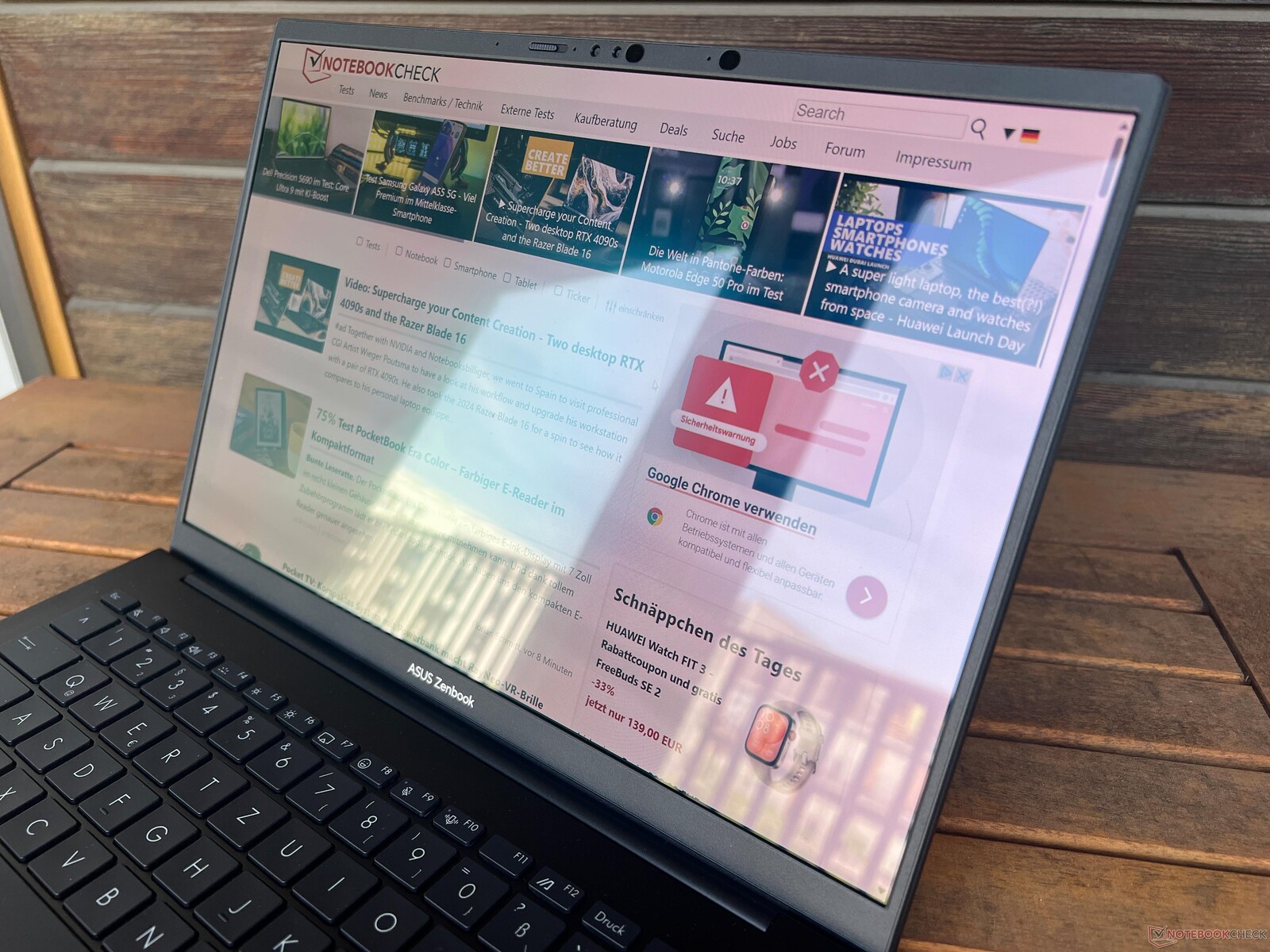 AMD 机型的低价是在内存限制(最多 16GB,且不可升级)和屏幕的帮助下实现的。全高清 OLED 屏幕拥有非常生动的画面,包括准确的色彩还原,华硕仍然是唯一一家在 OLED 面板中集成了防止低亮度时 PWM 闪烁的软件解决方案的制造商。较低的分辨率并不是真正的问题所在--它实际上有助于延长电池寿命--但如果你已经习惯了更高频率的屏幕,60 Hz 的限制可能会让你望而却步。此外,高反射面板(无触摸功能)在室内也会带来一些问题。