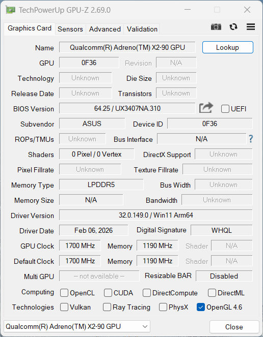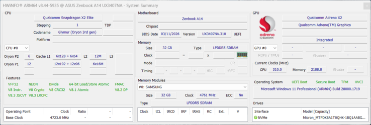 | Asus Zenbook A14 UX3704NA Qualcomm Snapdragon X2 Elite X2E-88-100 ⎘ Qualcomm Adreno X2-90 ⎘ 32 GB Memory, 1024 GB SSD | 992 g | 15.9 mm | 14.00" 1920x1200 162 PPI OLED | ||