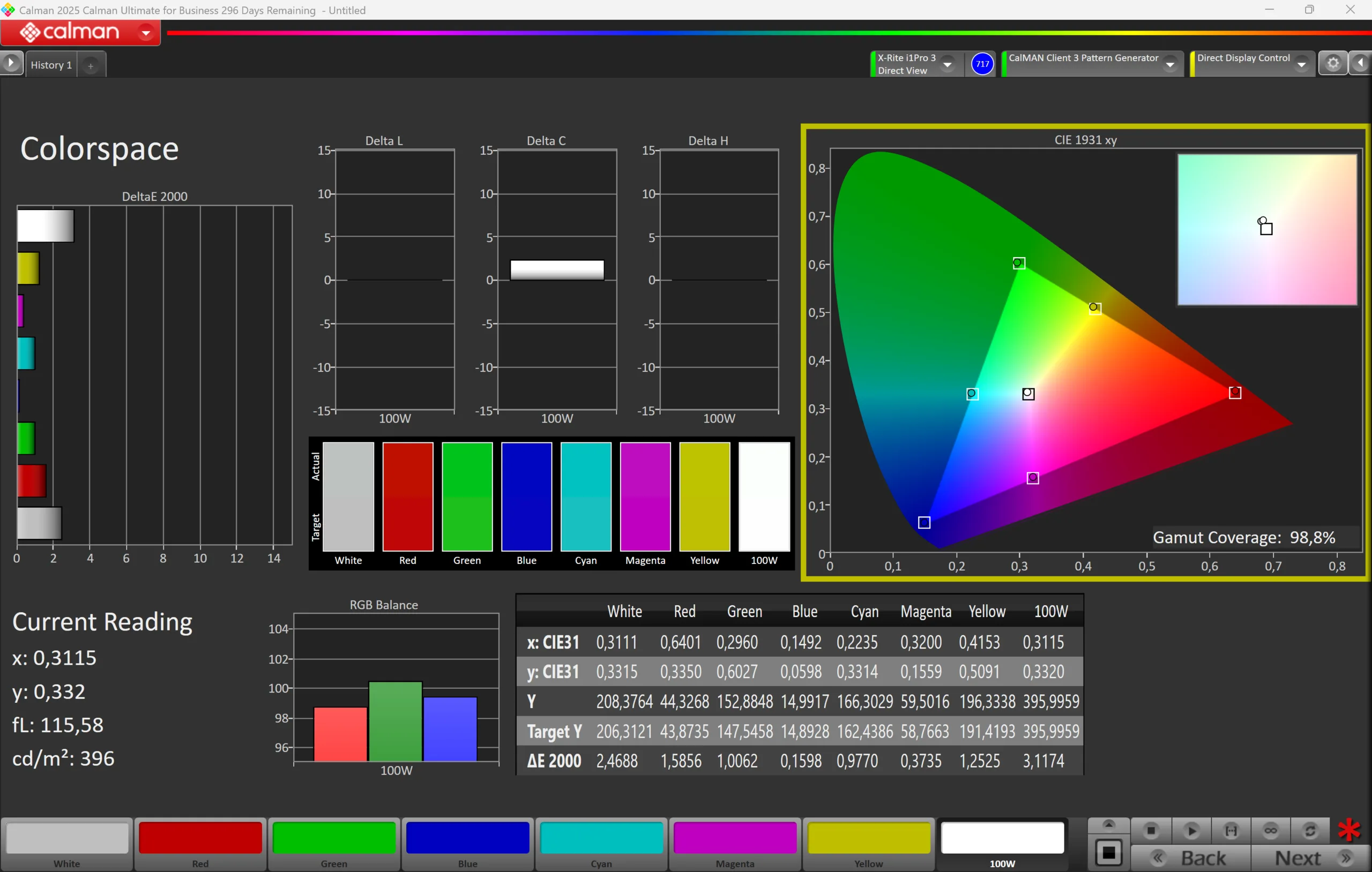 | sRGB Coverage (%) | 98.8 | 98.6 0% | 95.3 -4% | 99.9 1% | 100 1% | 100 1% | 100 1% | 98.2 -1% | 100 1% |