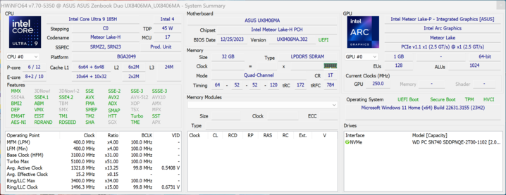 | Asus Zenbook Duo OLED UX8406MA Ultra 9 185H, Arc 8-Core, WD PC SN740 SDDPNQE-2T00, OLED, 2880x1800, 14" | Lenovo Yoga Book 9i 2-in-1 Dual Screen i7-1355U, Iris Xe G7 96EUs, WD PC SN740 512GB SDDPMQD-512G-1101, OLED, 2880x1800, 13.3" | HP Spectre x360 14-eu0078ng Ultra 7 155H, Arc 8-Core, Kioxia XG8 KXG80ZNV2T04, OLED, 2880x1800, 14" | Dell Latitude 9440 2-in-1 i7-1365U, Iris Xe G7 96EUs, Samsung PM9B1 1024GB MZAL41T0HBLB, IPS, 2560x1600, 14" | Lenovo Yoga 9 14IRP G8 i7-1360P, Iris Xe G7 96EUs, SK hynix PC801 HFS512GEJ9X101N BF, OLED, 2880x1800, 14" | Asus Zenbook Pro 14 Duo OLED UX8402ZA i7-12700H, Iris Xe G7 96EUs, Samsung PM9A1 MZVL2512HCJQ, OLED, 2880x1800, 14.5" | Asus ZenBook 14 UX3405MA Ultra 7 155H, Arc 8-Core, Micron 2400 MTFDKBA1T0QFM, OLED, 2880x1800, 14" | Average Intel Arc 8-Core iGPU | Average of class Convertible | |