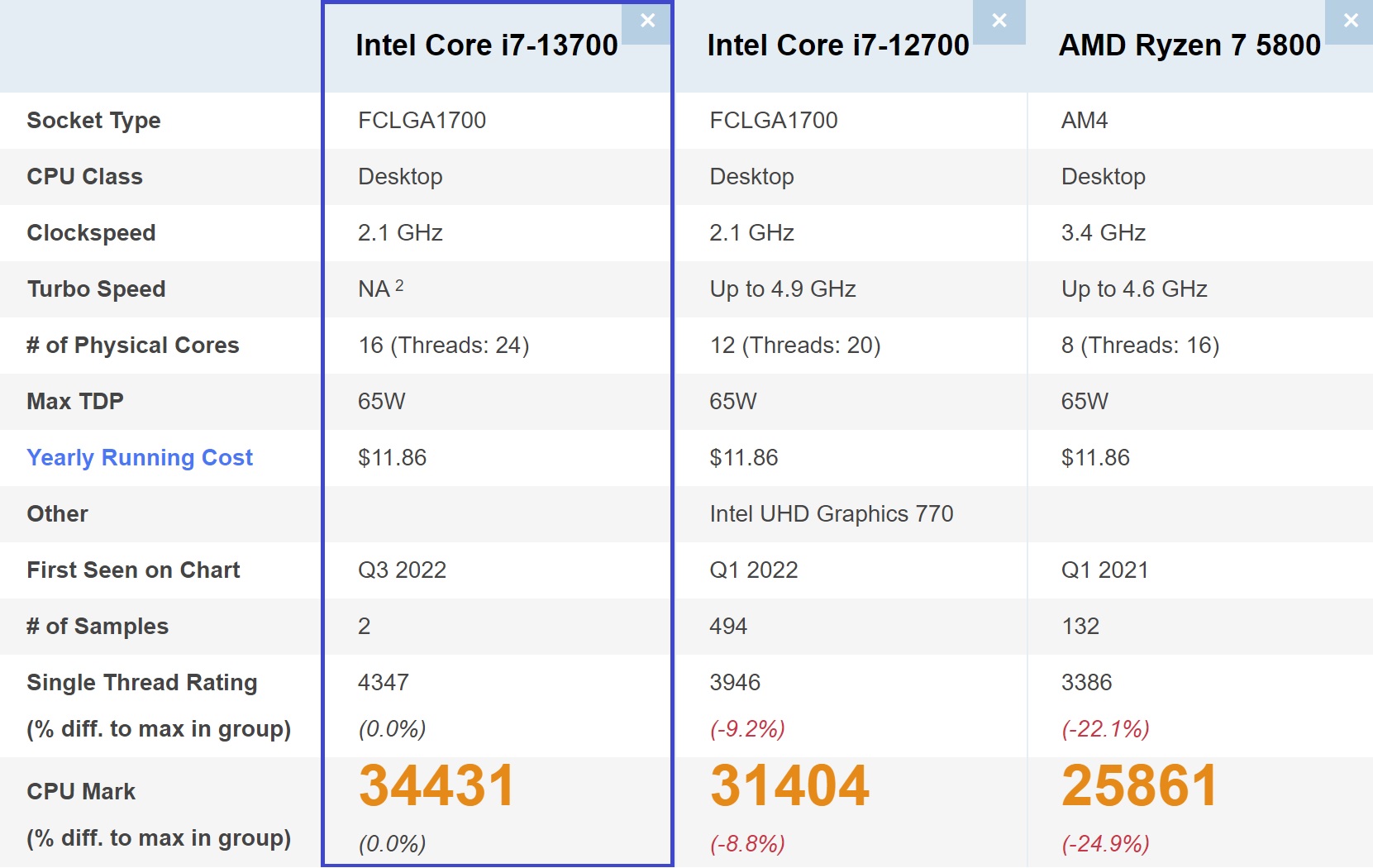 它是英特尔酷睿i7-13700已经成为第一个出现在PassMark合成基准上的猛禽湖处理器,尽管其他产品也多次出现在其他地方。 SKU.i7-13700产生了4347的单线程评级和34431的CPU标记。在高端台式机处理器。中,后者的得分高到足以让i7-13700与以下同类产品相提并论 i7-12700K和AMD Ryzen 9 5900。到目前为止,已经有两个样品进行了测试,留下了很高的误差幅度。