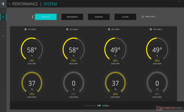 根据电源配置文件、GPU和亮度设置,在桌面上空转时的功耗在25W和50W之间。这个范围甚至在该类别中也是偏高的,因为其他16英寸机型,如Razer Blade 16或 其他16英寸机型,如Razer Blade 16或Alienware m17在类似的最低功率设置下,可以达到15W。
