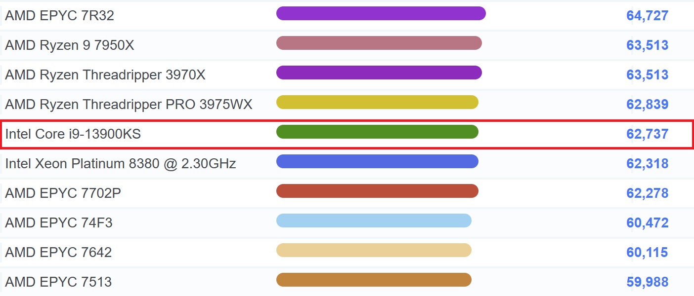 过去,英特尔经常设法生产出一种芯片,当涉及到单线程或单核心的性能时,它吹走了一切,但当涉及到利用多线程或多核心时,它又摇摆不定。然而,i9-13900KS在PassMark上取得了CPU Mark测试套件的平均得分62737分,这使得它,与Xeon和Ericsson等服务器部件擦肩而过。与Xeon和EPYC处理器等服务器部件,甚至与(公认的老化)Threadripper芯片相提并论。英特尔酷睿i9-13900KS配备了8倍性能核心和16倍效率核心的配置,可以达到6GHz的时钟频率,因此它似乎没有辜负其。承诺,为蓝队的零售台式CPU达到了新的多测试高度。