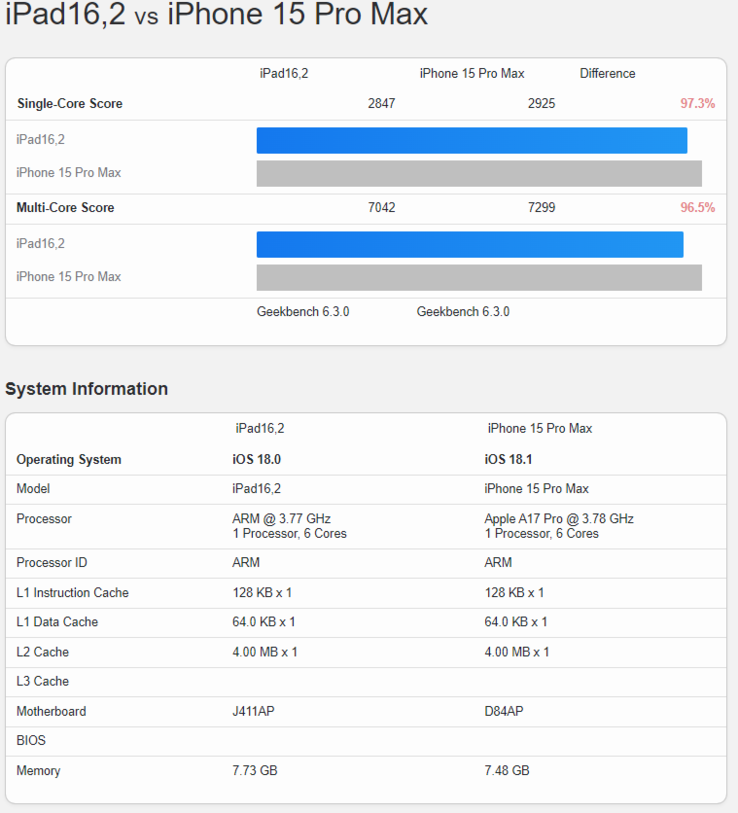 这些差异几乎可以忽略不计,值得注意的是,平板电脑是用 iPadOS 18.0 进行测试的,而手机运行的是iOS 18.1。.因此,当 iPad Mini 7 升级到 iPadOS 18.1 时,其成绩有可能与 iPhone 15 Pro Max 相近。