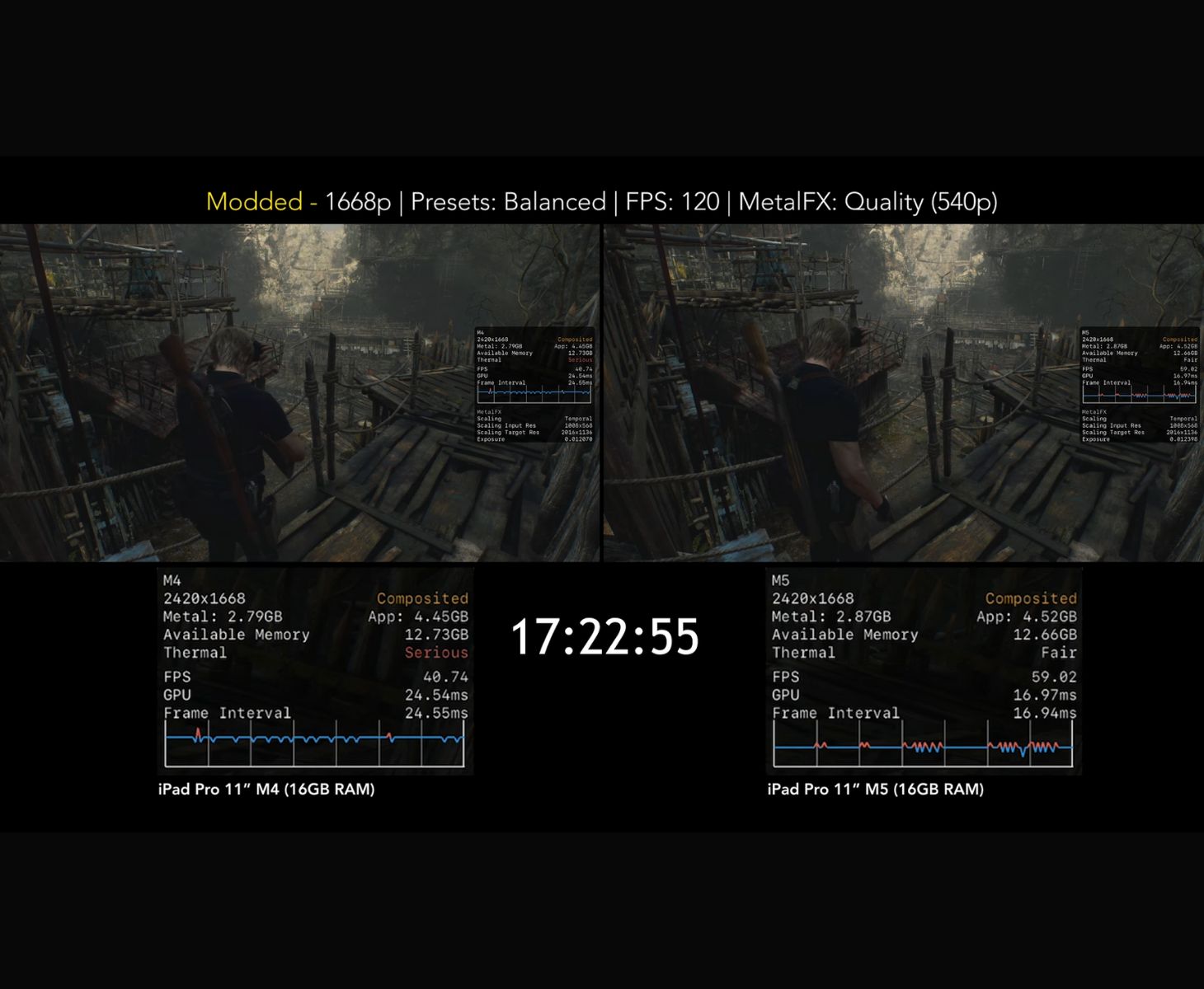 当 YouTuber 修改配置文件,将预设值设为平衡、降低分辨率、启用 MetalFX 质量模式并将 FPS 目标值设为 120 时,游戏的运行速度约为 60 FPS。在这些更高的设置下,M5 iPad Pro 的 FPS 在 50-60 之间。与此同时,M4 iPad Pro 降到了 40 多分,而 M1 甚至连 20 FPS 都难以维持。