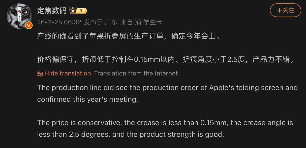近日,Fixed Focus Digital 通过微博分享了一份泄露信息。通过微博透露了有关上述 iPhone Fold 无褶皱显示屏的一些有趣细节。据他称,该产品确实已确定将于今年推出,生产订单已经下达。