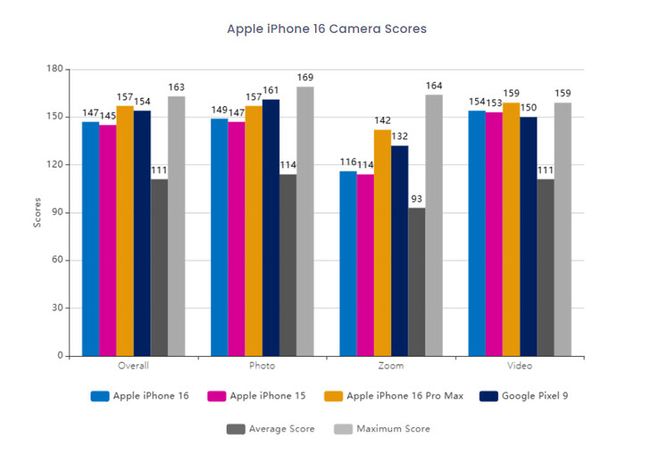 DxOMark 显示,标准版 iPhone 16 在相机测试中的总得分为 147 分。这一分数高于三星Galaxy S24 Ultra(144 分)及其前代产品(145 分)。不过,这款非 ProApple 旗舰机明显落后于谷歌 Pixel 9(128 GB,亚马逊现价 649 美元),后者的总得分为 154 分。