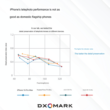 为了让用户更好地了解长焦照片的质量,DxOMark 提供了一张图表,显示不同焦距下细节的保留程度。在这张图表中,该公司将 iPhone 16 Pro Max 与 vivo X100 Pro 进行了比较、 华为 Pura 70 Ultra和小米 14 Ultra 进行比较。