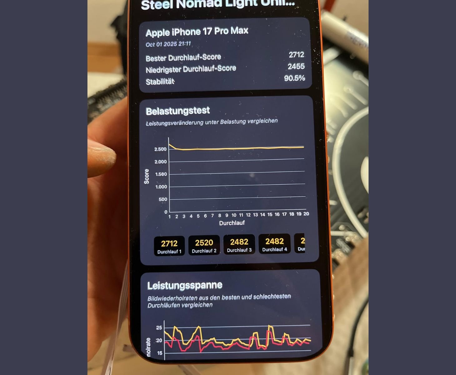 我们最近看到了 Apple iPhone 17 Pro Max 的散热系统是如何工作的运行《刺客信条:幻影》和《生化危机 4》等 AAA 级游戏时的散热系统。iPhone 17 Pro Max 不仅能以 60 FPS 的速度运行此类游戏,而且不会出现热节流现象。即使在 GPU 基准测试中,如 3DMark Solar Bay 压力测试、 iPhone 17 Pro Max 也表现出色特别是考虑到它现在配备了功能更强大的全新 A19 芯片。对于一款没有风扇等主动散热装置的移动计算设备来说,iPhone 17 系列感觉是 iPhone 16 系列的真正升级版。