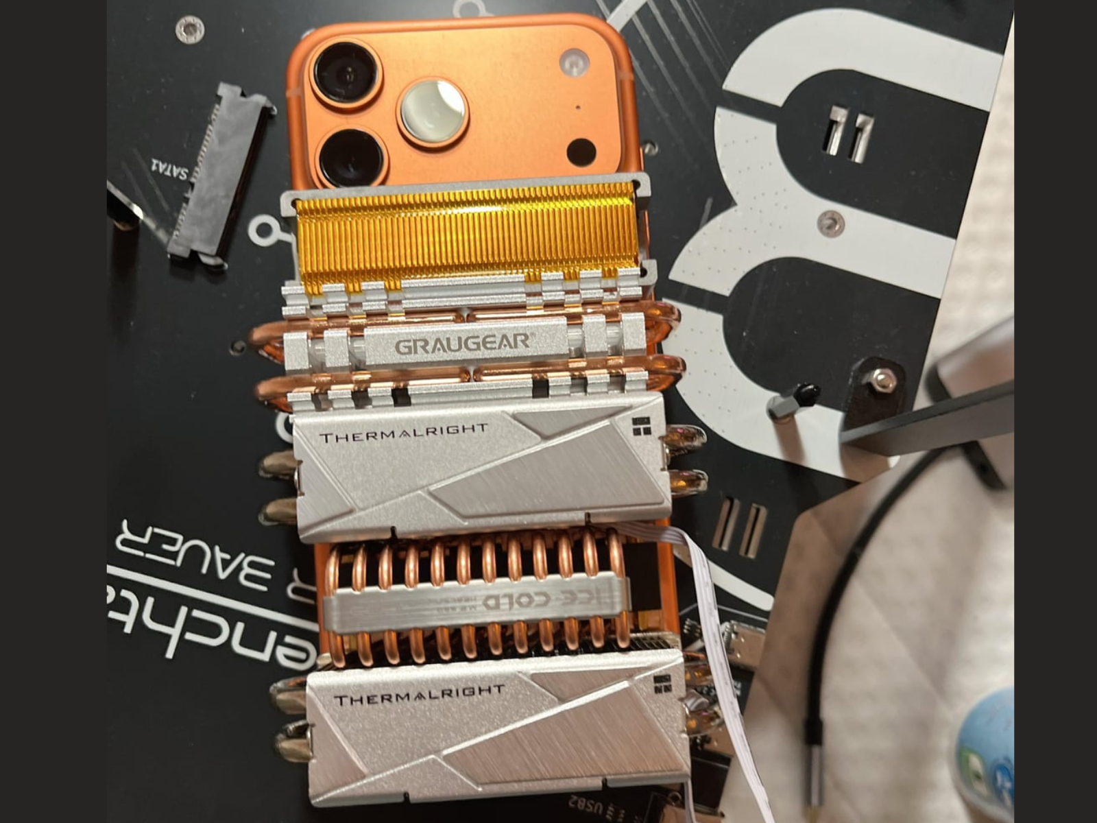 Reddit 上一篇题为 "17 Pro Max Cooling with M2 SSD Cooler 90% Stability in 3D Mark Stress Test "的帖子中的照片展示了一种 DIY 冷却设置,将通常用于 SSD 的台式机级散热片和热管冷却器安装到 iPhone 17 Pro Max 上,以减少重度游戏或基准测试时的热跳动。