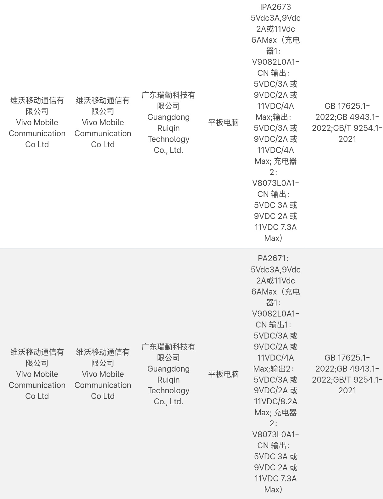 具体来说,该公司正在开发 iPA2673 和 PA2671,如下图所示。根据 CCC 提供的数据,这两款平板电脑在 7.3 A/11 V 电压下支持略高于 80 W 的有线充电。仅从这个充电功率来看,Digital Chat Station 推断 iPA2673 和 PA2671 就是 iQOO Pad6 Pro 和 vivo Pad6 Pro 的型号。