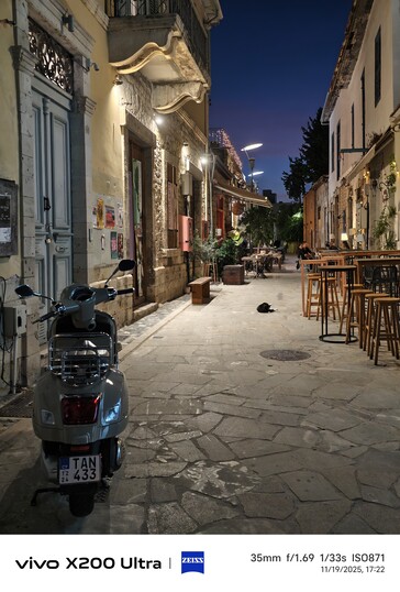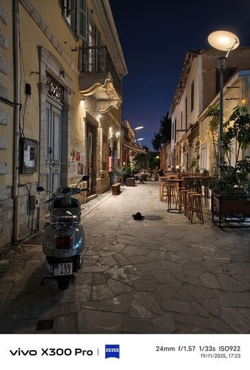乍一看,Galaxy S23 Ultra 上曝光过度的灯管非常显眼,而 vivo 的三款机型对高光的控制要好得多。vivo X200 Ultra 显示的远处物体细节最多,考虑到其 35 毫米的焦距,这一点也不足为奇。事后看来,这一结果支持了 vivo 放弃 IMX989 的做法:尽管传感器更小,但 vivo X100 Pro 即使在近距离也无法完全跟上。例如,在摩托车左侧,vivo X300 Pro 比 X100 Pro 和 X200 Ultra 显示出更多细节。